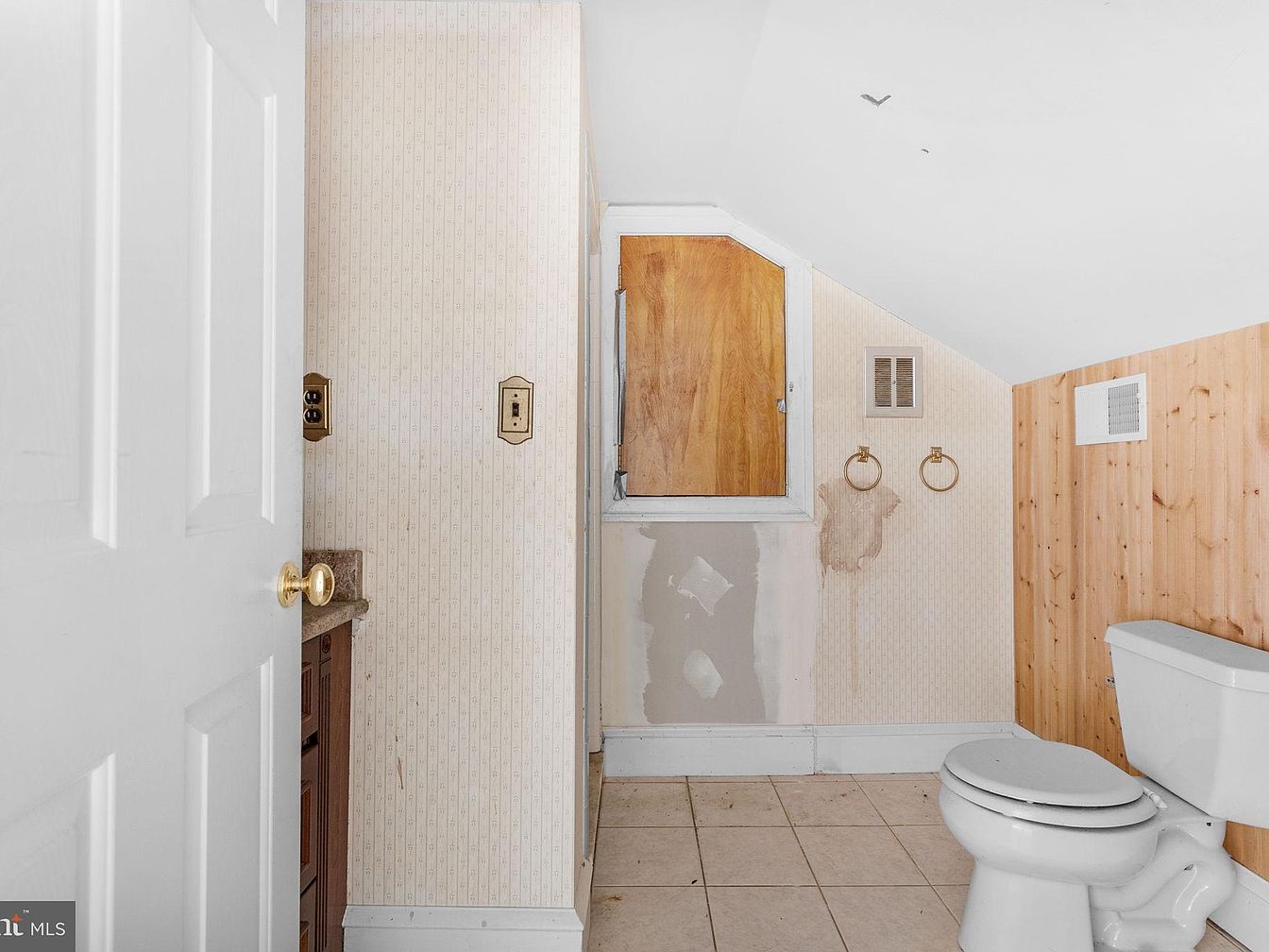 This charming bathroom features a thoughtful layout, combining functionality with cozy elements. The sloped ceiling adds character, while the warm wooden paneling enhances the inviting atmosphere. Equipped with essential fixtures, the white toilet contrasts beautifully against the soft, neutral tones of the walls, which showcase subtle vintage patterns. Generous counter space is available, perfect for family use, alongside wall-mounted towel rings for practicality. The unique window offers a glimpse of natural light, creating an airy feel. Its intimate design invites relaxation, making it a perfect retreat for those seeking comfort and warmth in a busy household.