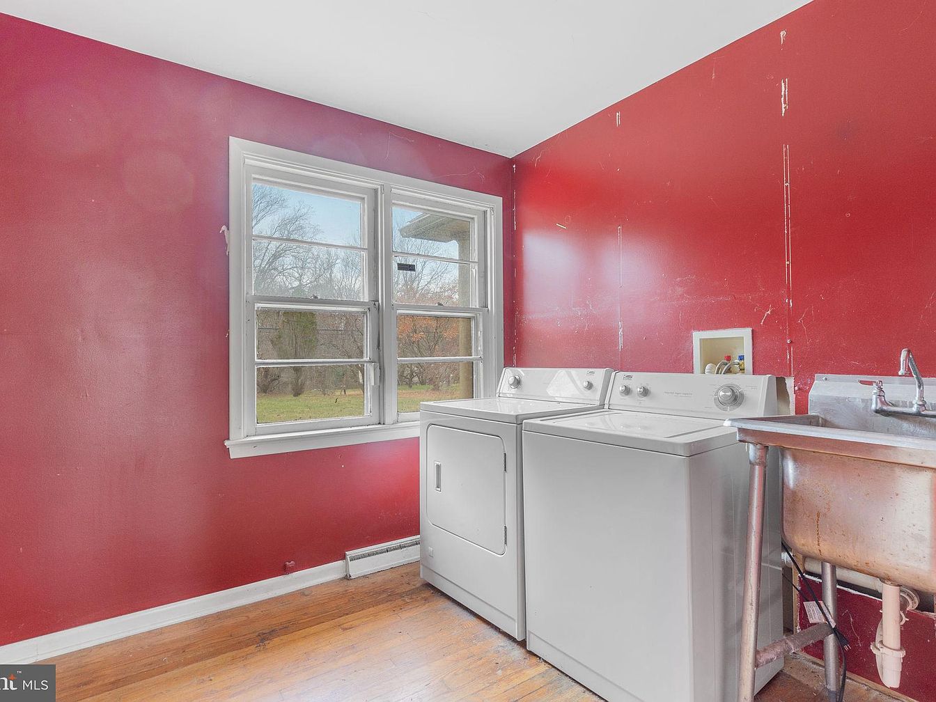 This cozy laundry room features a vibrant red accent wall that adds energy and warmth, complemented by large windows that invite natural light. The practical layout includes modern appliances, a spacious washer and dryer set, and a functional utility sink, perfect for everyday chores. The hardwood flooring brings a touch of classic charm, enhancing the room’s inviting atmosphere. Ample space allows for easy movement, making laundry day efficient. This family-friendly area is designed with convenience in mind, ensuring that essential tasks blend seamlessly with comfort, making it an ideal space for busy households.