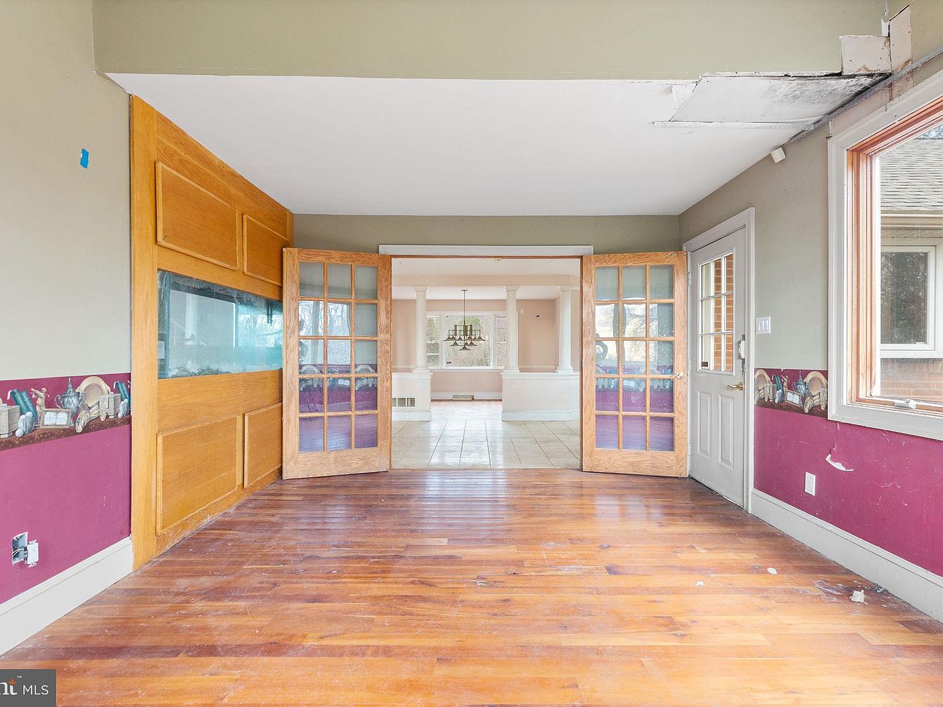This inviting entryway features elegant double doors that seamlessly connect multiple living spaces, fostering an open-plan ambiance perfect for family gatherings. Wooden flooring boasts rich, warm tones, while large windows allow natural light to fill the area, highlighting its spaciousness. The walls display a unique color palette, merging a soft green with playful burgundy accents, contributing to a cozy, welcoming atmosphere. Architectural details such as plaster columns in the adjoining room enhance the entry’s charm, making it a functional yet stylish welcome zone. Ample space for decorative elements or family photos makes it ideal for personalization.