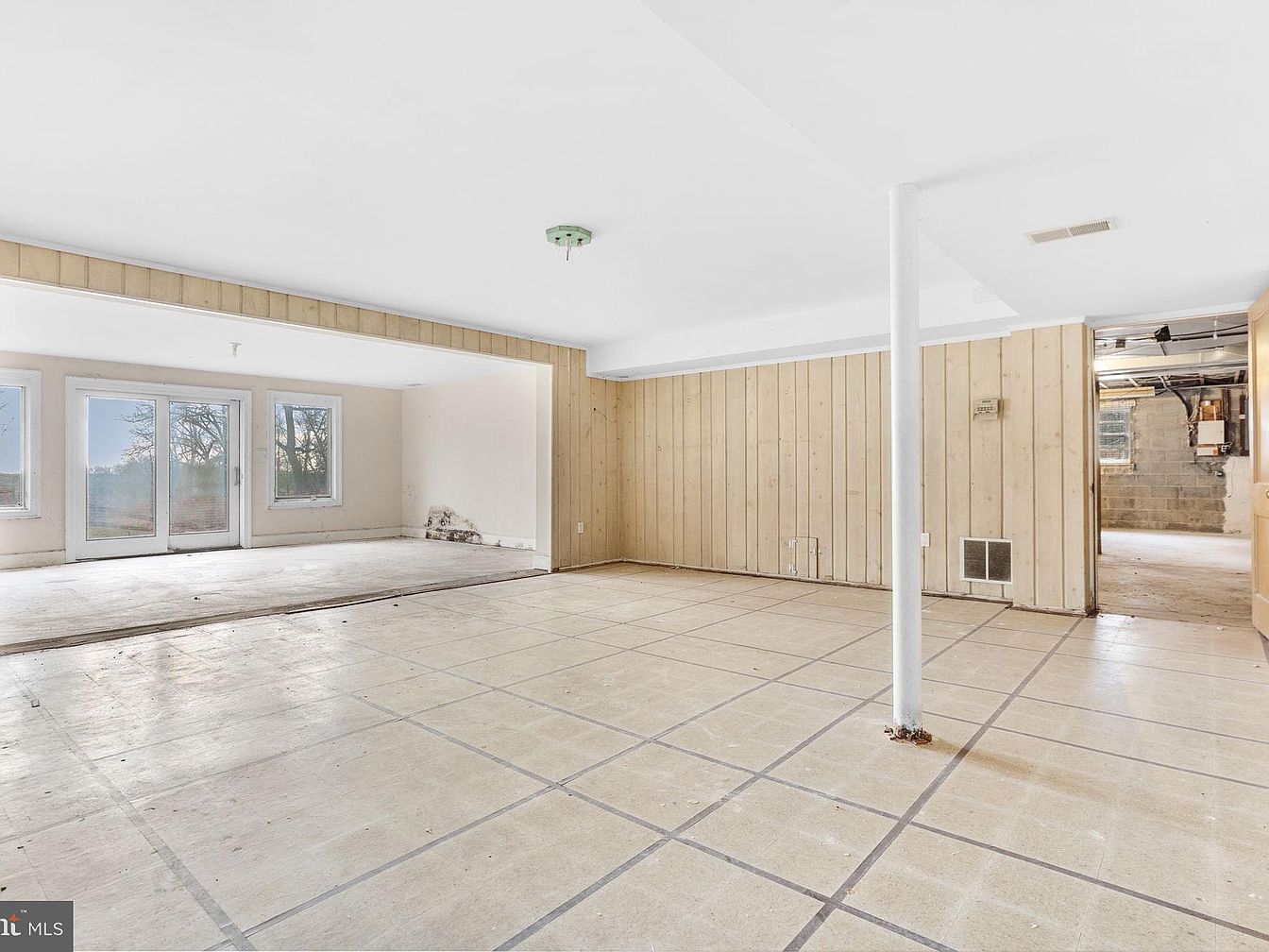 This expansive living area features a neutral color palette with natural wood paneling that creates a warm, inviting atmosphere. Large sliding glass doors flood the space with natural light, enhancing the feeling of openness and connection to the outdoors. The open-concept layout fosters a family-friendly environment perfect for gatherings, while the bare, polished concrete floor offers a blank canvas for any design preference. Architectural beams and a central support post add character, while providing an opportunity for creative space division. This room provides limitless potential for customization, making it an ideal foundation for family memories.