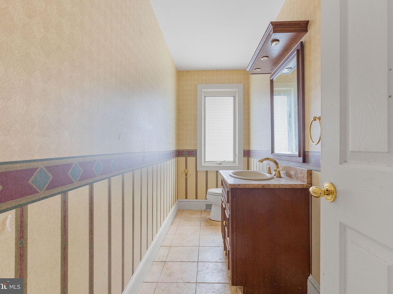 This spacious bathroom features a classic layout with elegant design elements. The warm beige wallpaper, complemented by a decorative striped and diamond-patterned trim, creates an inviting atmosphere. A stylish dark wood vanity adds contrast, showcasing a smooth granite countertop and an under-mount sink, perfect for family use. The large window allows natural light to flood in, enhancing the open feel. Functional design is reflected in the choice of fixtures, including a gold-toned faucet and towel ring. Subtle tile flooring integrates practicality and style, making this bathroom not only stylish but also family-friendly and functional.