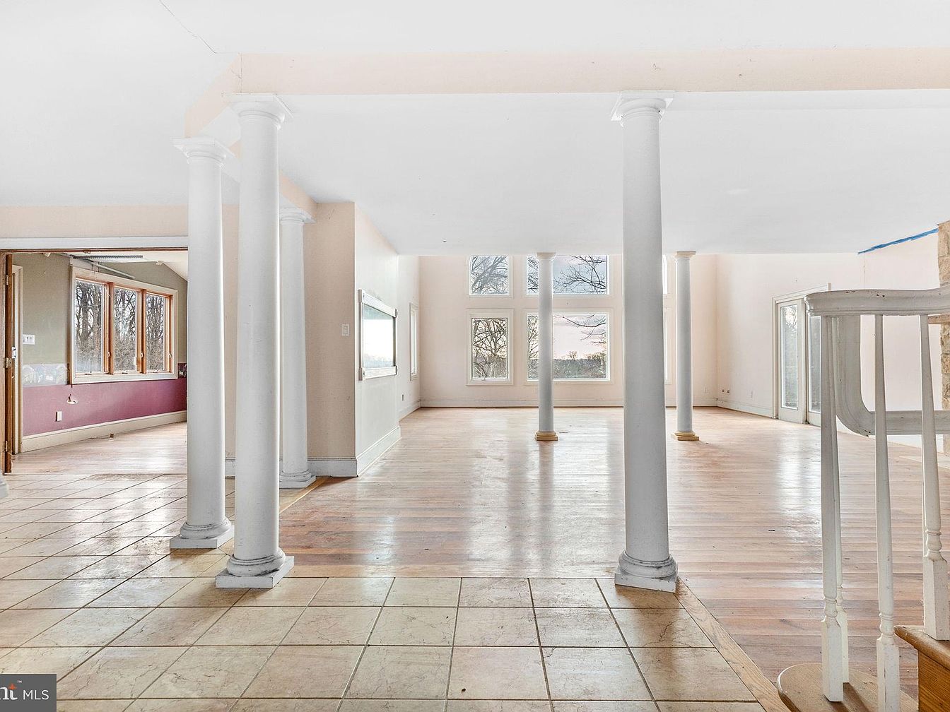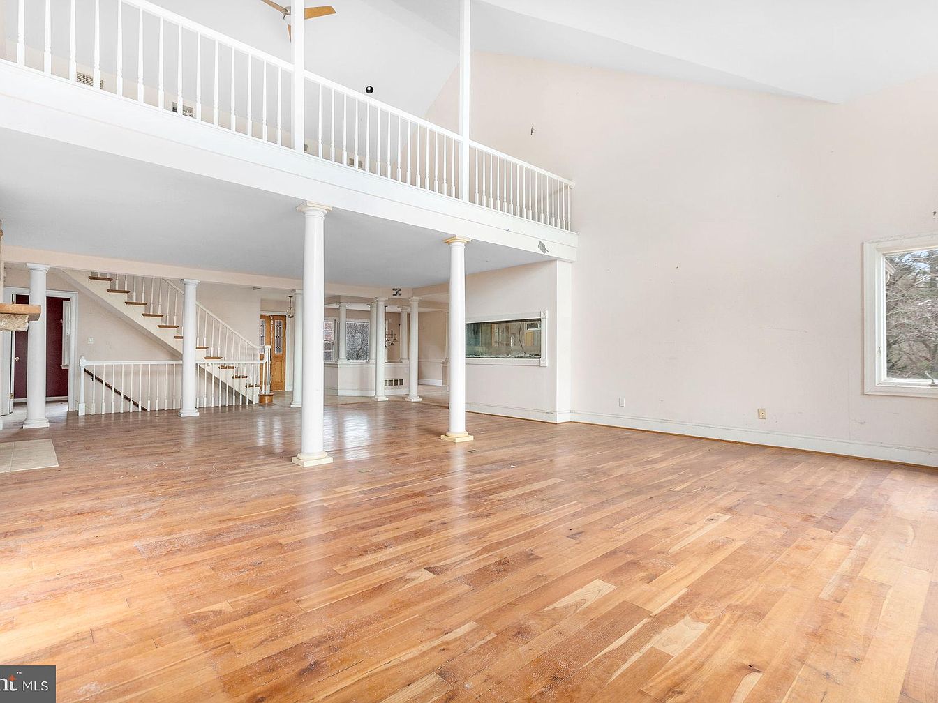 This expansive living area features soaring ceilings, enhancing the sense of openness. Supported by elegant white columns, the layout invites natural light through large windows, creating a warm and inviting atmosphere. Rich hardwood flooring adds to the charm, perfectly complementing the neutral color palette of pale walls. The space is family-friendly, ideal for gatherings or play, with ample room for comfortable furniture arrangements. The strategically placed staircase leads to an upper balcony, allowing for a dynamic view of the main area. Thoughtful architectural details, such as the railing and natural light integration, elevate the overall aesthetic.