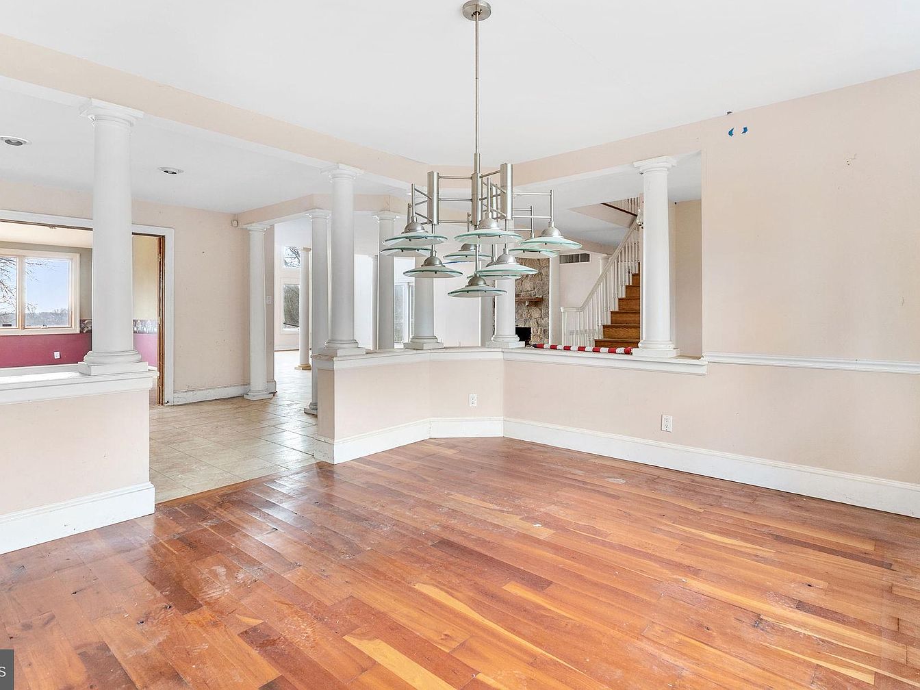 This spacious dining area seamlessly blends practicality with elegance, featuring rich hardwood flooring that adds warmth and character. Elegant white columns define the space, creating a sophisticated entryway to the adjoining areas. A contemporary chandelier with glass accents hangs above, providing ample lighting for family gatherings. The soft, neutral color palette enhances the room’s airy atmosphere, while large windows invite natural light, making it perfect for casual dining or festive occasions. Ample space encourages movement, making it ideal for family interactions, and the open layout fosters connectivity with the kitchen and living areas.