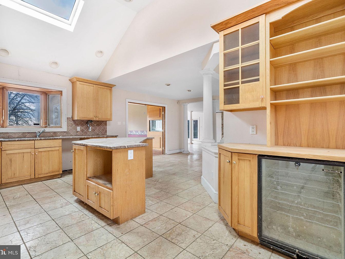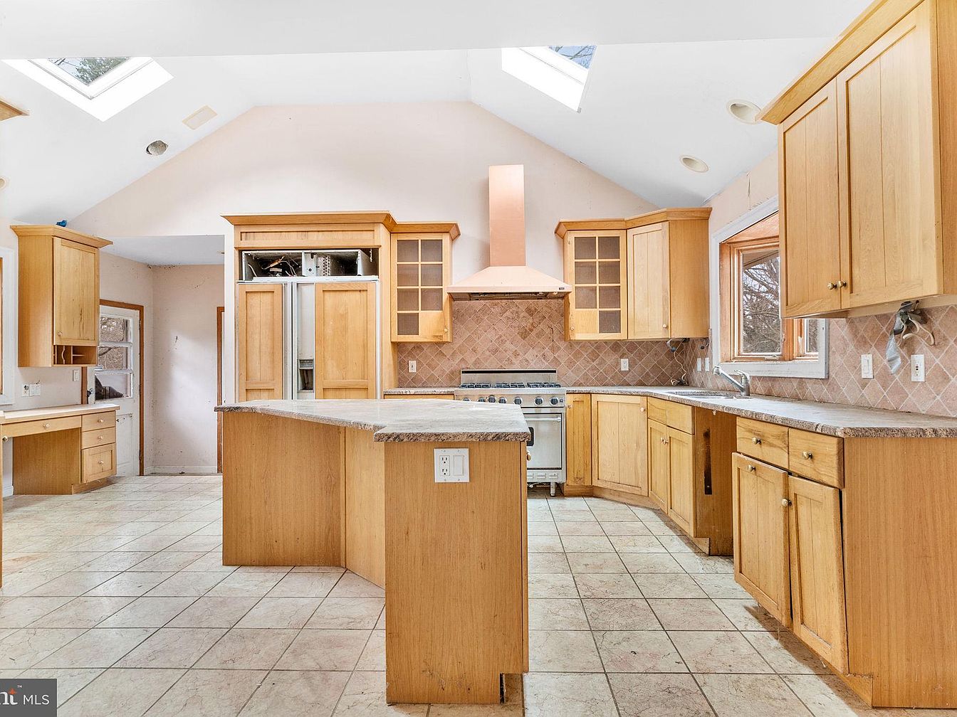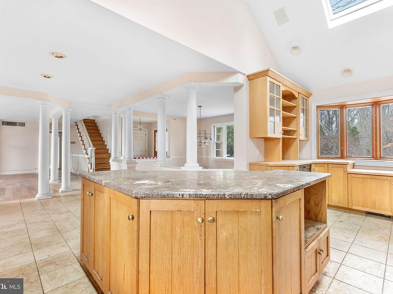 This spacious kitchen showcases an inviting layout, ideal for family gatherings. The warm wooden cabinetry complements the neutral color scheme, exuding a welcoming ambiance. Skylights illuminate the room, enhancing the airy feel, while large windows invite natural light and views of the outdoors. The expansive island serves as a multifunctional workspace, perfect for meal prep or casual dining. High-end appliances are seamlessly integrated, ensuring functionality alongside elegance. Textured stone tiles add a touch of sophistication to the flooring, making it both attractive and easy to clean. This kitchen harmonizes style and practicality for everyday living.