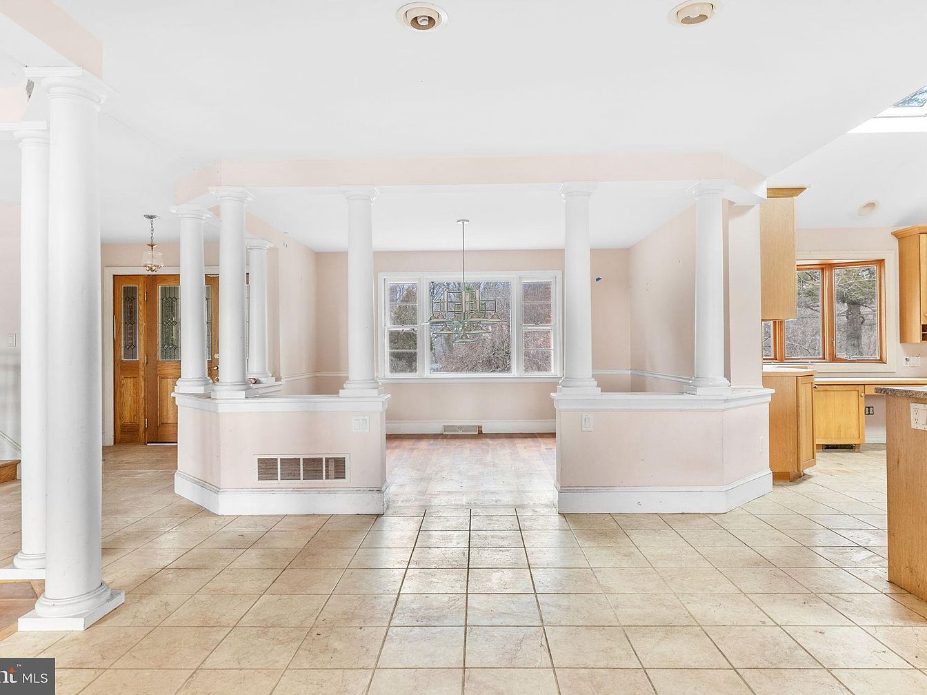 This inviting open-concept space seamlessly merges the living area and kitchen, creating an ideal family-friendly atmosphere. Tall, white columns define the layout while enhancing the airy feel. The warm, natural light floods in through large windows, merging indoor and outdoor views. Soft peach walls complement the tiled flooring, exuding a cozy ambiance. Functional wooden cabinetry in the adjoining kitchen adds a touch of warmth and practicality. Perfect for gatherings, the expansive area accommodates various furniture arrangements, promoting connectivity. A neutral color scheme ensures versatility, allowing personalized decor to shine in this welcoming home environment.