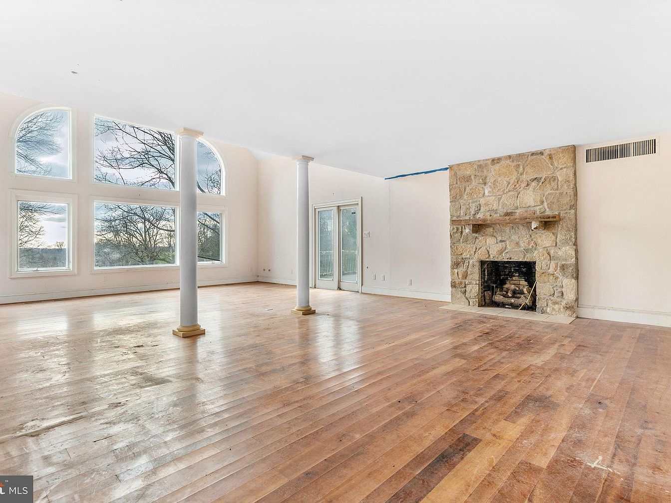 Featuring soaring ceilings and expansive windows, this living area invites an abundance of natural light, creating a bright and airy atmosphere. The spacious layout is framed by elegant columns, perfect for family gatherings and entertaining. Rich hardwood floors add warmth, complementing the rustic charm of the stone fireplace, which serves as a focal point. Neutral, soft hues on the walls offer a versatile backdrop for personal decor choices. The seamless connection to the outdoors through sliding doors enhances the family-friendly aspect, allowing for easy movement between indoor and outdoor spaces, ideal for relaxation and fun.