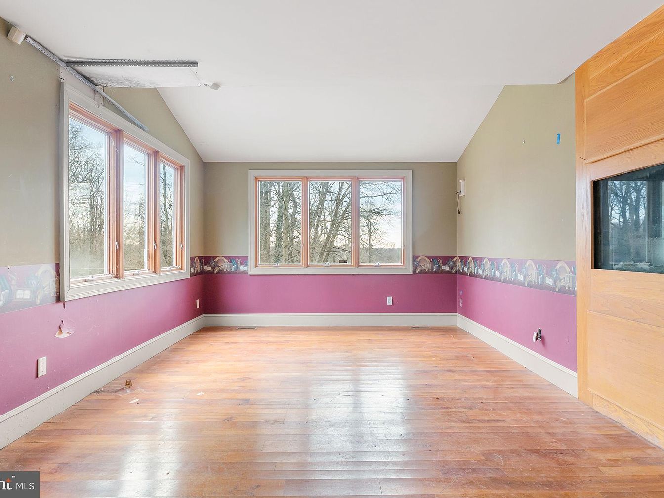 This spacious family room features expansive windows that flood the area with natural light, showcasing scenic views of the outdoors. The layout offers a versatile space, perfect for family gatherings or playtime. The color scheme combines warm earth tones with a playful purple accent wall, enhanced by a whimsical border that adds character. Rich hardwood flooring provides warmth and durability, ideal for active households. Simple architectural details, such as the clean lines of the walls and the wooden door, emphasize a modern yet inviting atmosphere, making it a perfect canvas for personal touches and family memories.