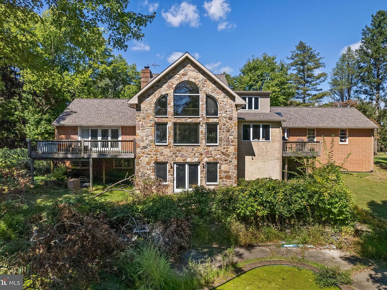 This impressive American home features a striking blend of stone and brick exterior, showcasing its unique architecture. The large arched windows allow for an abundance of natural light, enhancing the warm, inviting atmosphere. A spacious multi-level deck extends from the rear, perfect for family gatherings and outdoor entertaining. Lush greenery surrounds the home, providing a serene backdrop and a sense of privacy. The thoughtful design includes various architectural elements, such as the combination of textures and natural materials. This home exudes a charming, family-friendly appeal, ideal for both relaxation and vibrant outdoor activities.