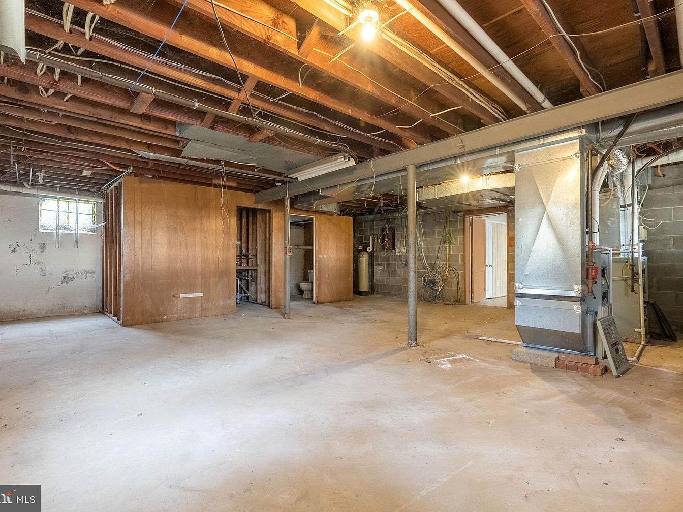 This versatile basement offers a blank canvas, ideal for creating a functional family retreat or recreational area. Exposed wooden beams and a spacious layout enhance the feeling of openness, while large windows allow natural light to filter in, brightening the otherwise subterranean space. The unfinished walls suggest potential for customization, enabling homeowners to design tailored storage solutions or cozy nooks. Key features include accessible plumbing, making it convenient for future bathroom or laundry installations. The neutral concrete floor and simple infrastructure serve as a clean backdrop for various design possibilities, inviting creativity into this practical area.