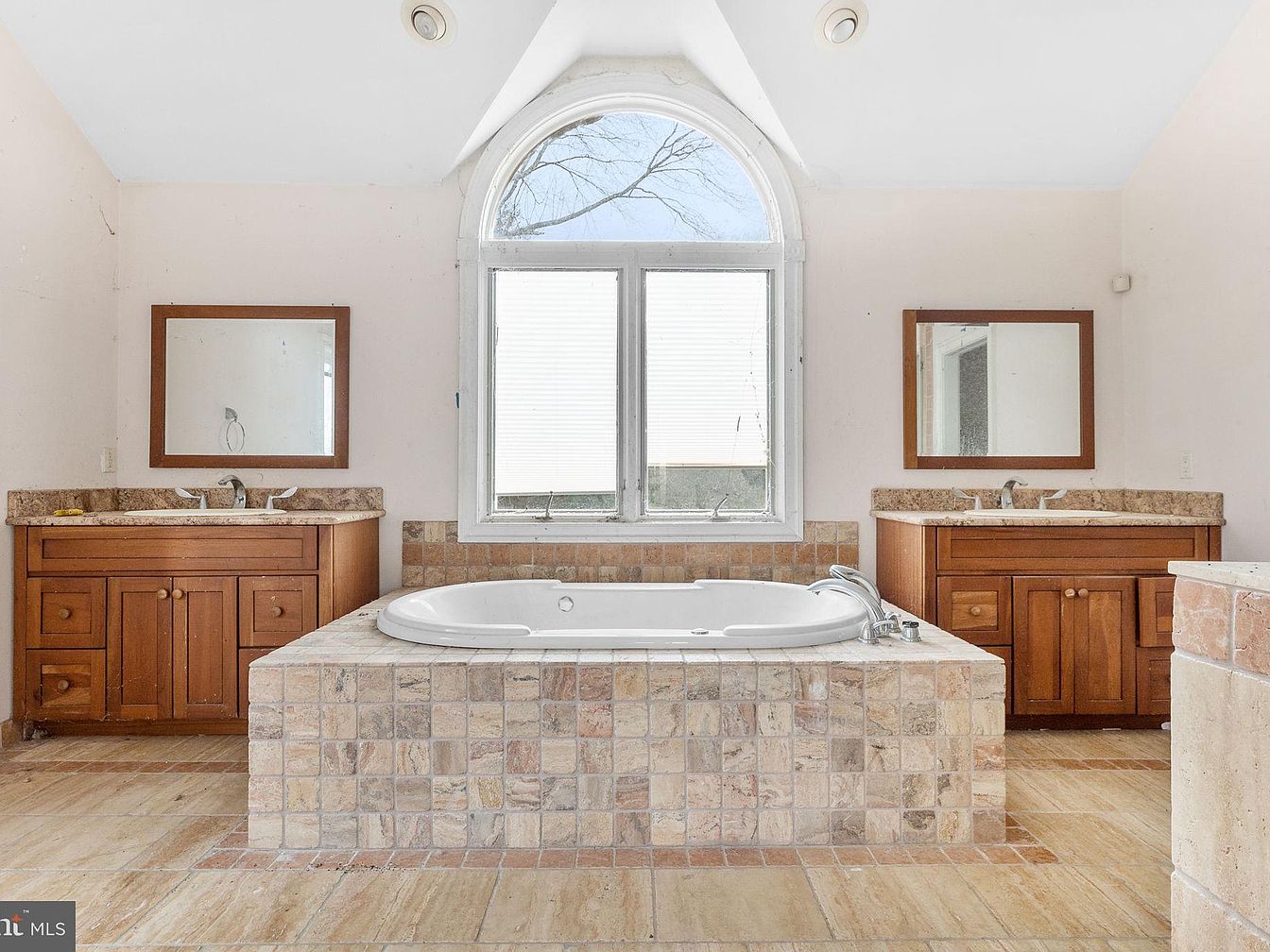 This spacious bathroom features elegant design elements, highlighted by a beautifully tiled platform tub that becomes the focal point. Flanking the tub are two vanities crafted from rich wood, providing ample storage and counter space. The warm tones of the cabinetry complement the natural stone tiles underfoot, while large windows invite abundant natural light, enhancing the tranquil atmosphere. The dual mirrors create a feeling of openness, making this retreat both functional and inviting. Ideal for families, the layout accommodates a shared experience, offering comfort and relaxation in an aesthetically pleasing environment.