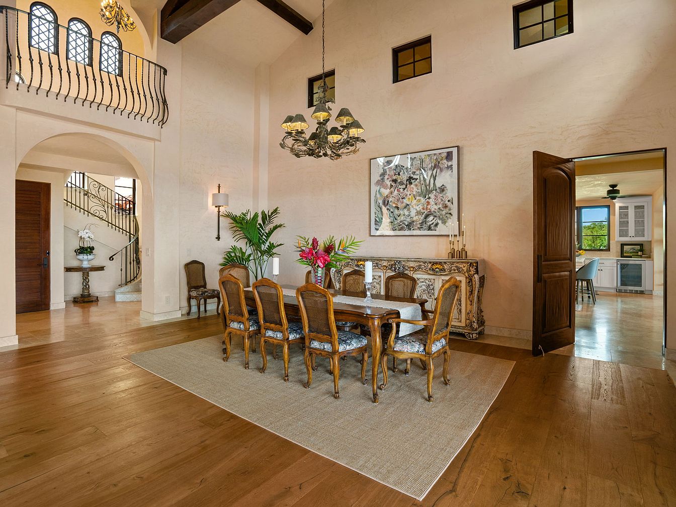 A spacious and elegant formal dining area, perfect for family gatherings and entertaining guests. The room features high, vaulted ceilings with exposed dark wooden beams that create a sense of grandeur. Soft, creamy walls enhance the natural light streaming through the upper windows, while ornate wrought iron railings and archways add Mediterranean charm. The long wooden dining table comfortably seats eight, making it ideal for large family meals. Intricate chairs, fresh greenery, and a vibrant floral centerpiece provide a welcoming touch. The neutral-tone rug grounds the space, and the adjoining kitchen ensures convenience for everyday family use.
