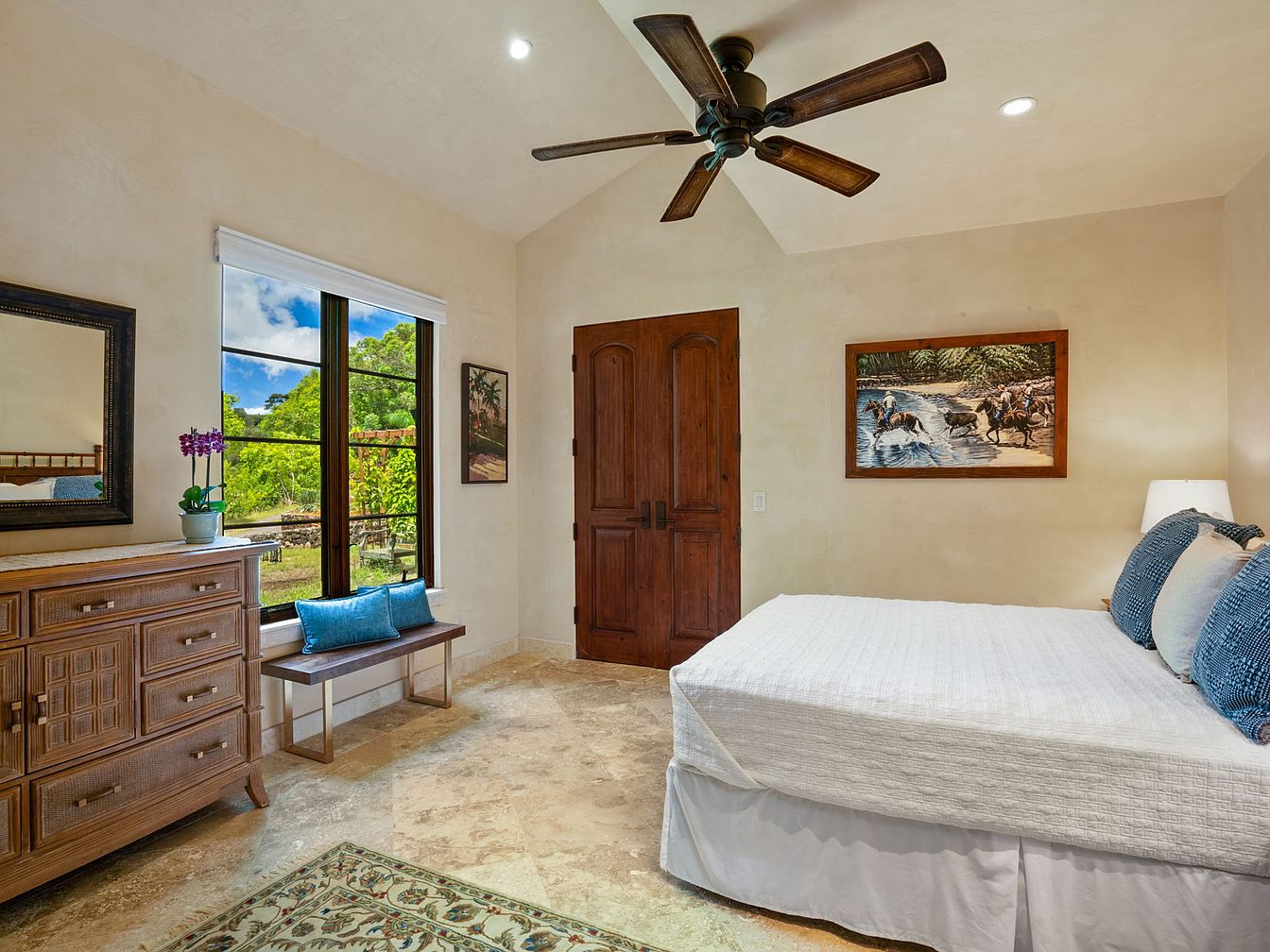 Warm neutral walls and large windows create a bright, welcoming bedroom space with views of lush greenery outside. Natural stone-style flooring adds elegance and durability for active families. The wooden elements, door, dresser, and ceiling fan, introduce rustic charm, complemented by a bench beneath the window that invites relaxation or offers extra seating for children. Light bedding with soft blue accent pillows keeps the look fresh and inviting. Thoughtful artwork and a potted orchid add touches of personality and color, while layered lighting ensures comfort at any hour, making this room both practical and stylish for everyday living.