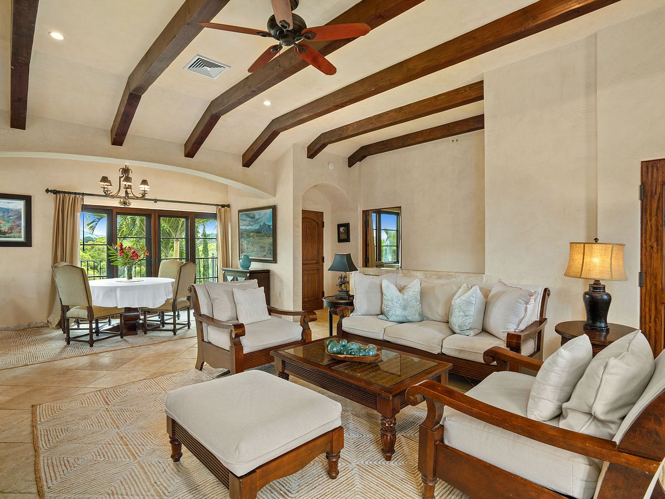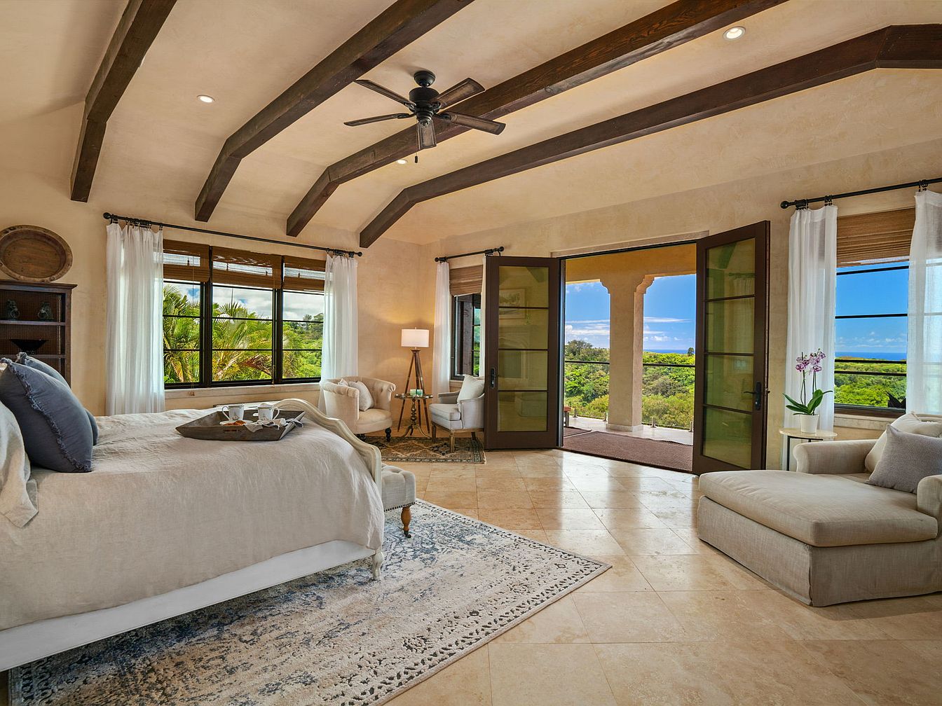 Spacious and airy, this master bedroom showcases rustic ceiling beams paired with creamy walls and large windows for abundant natural light. Double French doors open to a scenic balcony, seamlessly blending indoor comfort with outdoor serenity. The earthy tile flooring is complemented by a soft patterned rug beneath a plush bed dressed in neutral linens. Inviting seating areas, including a comfy armchair and a chaise lounge, provide cozy nooks for relaxation or family time. Soft white curtains, elegant wood furniture, and fresh greenery create a serene, family-friendly haven perfect for morning coffees or unwinding at sunset.