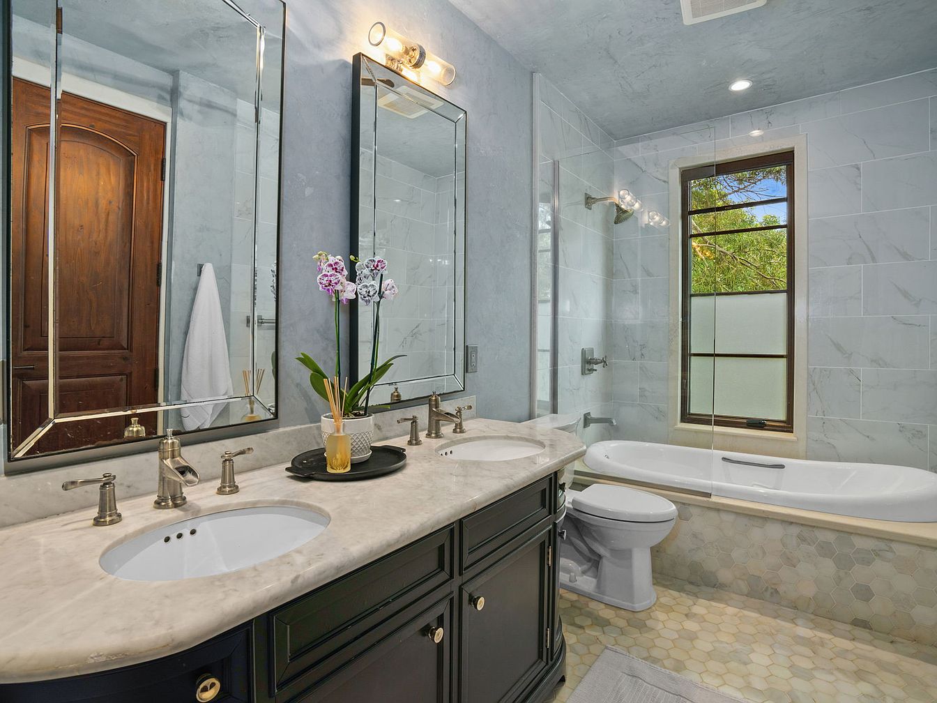 A luxurious bathroom features a beautiful double-sink vanity with marble countertops, accented by polished chrome fixtures and ample cabinet storage, perfect for family convenience. Twin mirrors and contemporary lighting enhance the space’s brightness and offer a clean, elegant look. Soft pastel blue walls and large marble tiles on the shower wall bring a tranquil, spa-like ambiance. The soaking tub, situated under a large window, fills the room with natural light, while frosted glass provides privacy. Thoughtful touches, such as a vase of fresh orchids and a subtle diffuser, add warmth and a welcoming, family-friendly atmosphere to the sophisticated design.