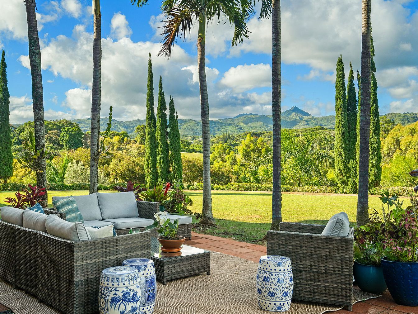 A welcoming outdoor patio sets the stage for relaxation, featuring a cozy L-shaped wicker sectional with soft, neutral-toned cushions. Decorative blue and white garden stools add charm and function as casual seating or side tables, perfect for family gatherings or entertaining friends. The space is anchored by a sturdy outdoor rug and surrounded by lush greenery and potted plants, highlighting a seamless connection to the expansive lawn and panoramic mountain views. Towering palm trees and evergreens provide shade and privacy, making this patio an ideal family-friendly spot to unwind together or enjoy nature.