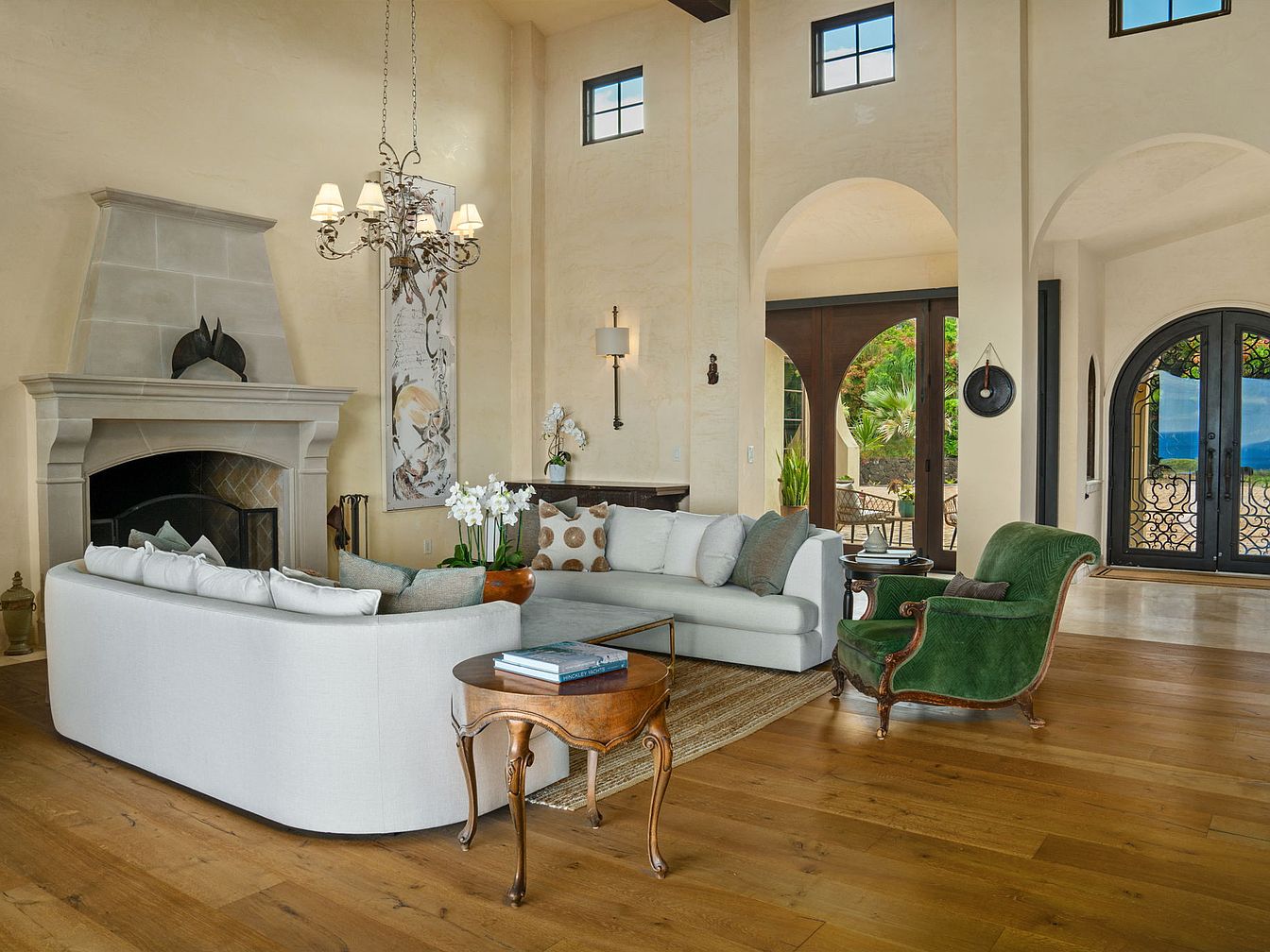 A spacious, sun-lit living room boasts high ceilings and arched doorways, creating an airy and welcoming atmosphere. The neutral color palette of cream walls and warm wood flooring is accented by a plush, curved white sectional and a classic green velvet armchair, perfect for family gatherings or quiet evenings by the elegant stone fireplace. The space is anchored by an ornate chandelier and large windows, allowing natural light to flood the room. Decorative pillows, a wooden coffee table, and modern art add both comfort and style, while the open layout ensures easy movement and family-friendly functionality.