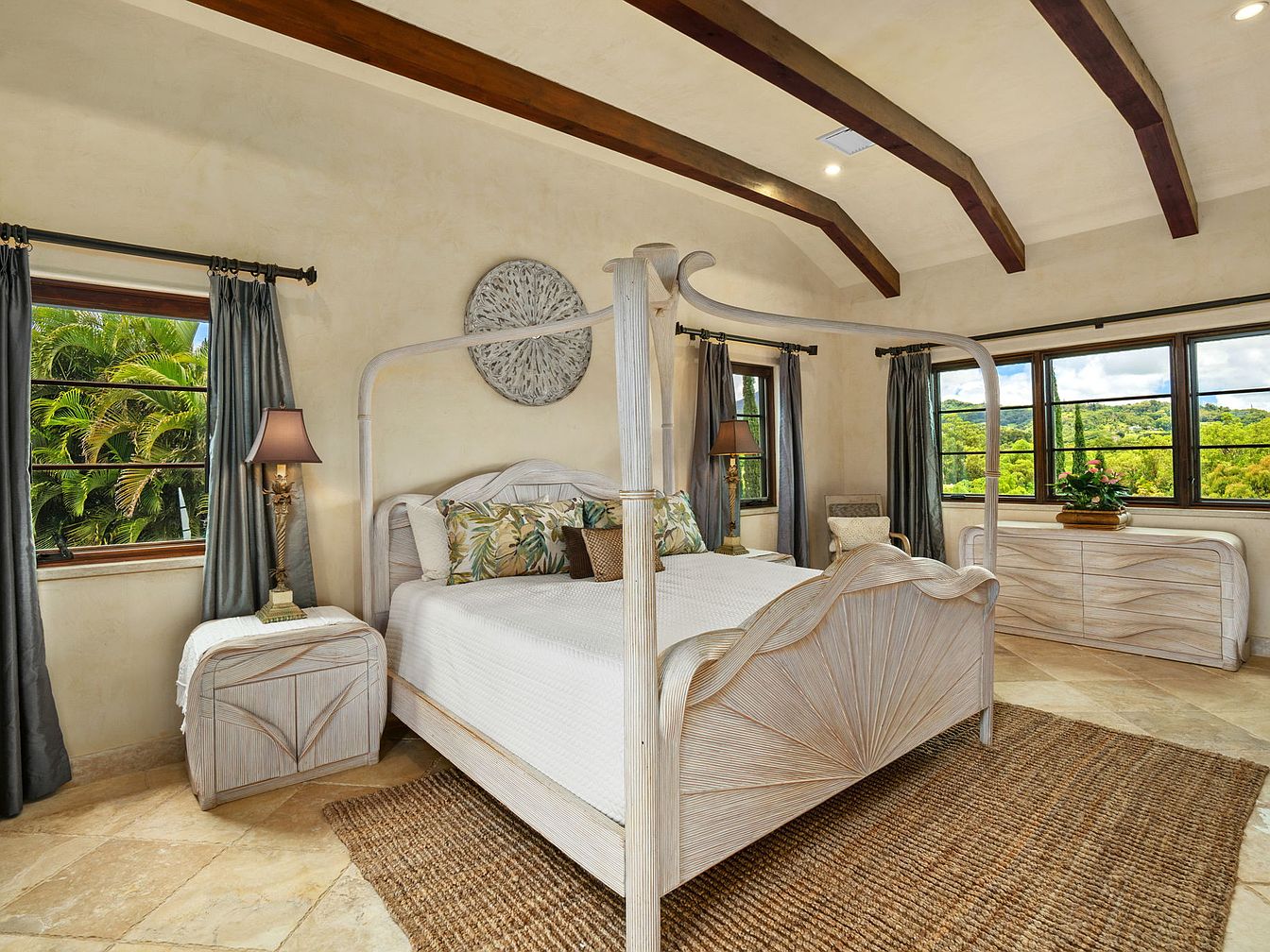 A serene and spacious primary bedroom featuring a sculpted four-poster bed with coastal-inspired carved wood details, complemented by soothing earth-toned walls and vaulted ceilings with exposed dark wooden beams. Large windows on two sides invite ample natural light and offer lush garden views, enhancing the room’s open feel. Woven textures, such as the jute area rug and botanical-print throw pillows, create a relaxed, welcoming environment ideal for families. Matching nightstands and a curved dresser present practical storage solutions while maintaining an airy, elegant style. Thoughtful touches like tall lamps and greenery add warmth and a homey ambiance.