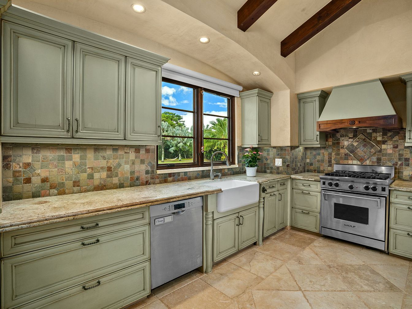 Warm and inviting, this kitchen features light sage cabinetry and a creamy stone countertop that complements the multicolored mosaic tile backsplash. Stainless steel appliances, including a professional range and dishwasher, are seamlessly integrated for both functionality and modern style. The farmhouse sink sits below a large window, offering plenty of natural light and a picturesque garden view. Exposed wooden beams on the arched ceiling add rustic charm while recessed lighting ensures a bright and practical work space. Soft, neutral tones promote a family-friendly atmosphere, and the open counter layout provides ample room for meal prep and gathering together.