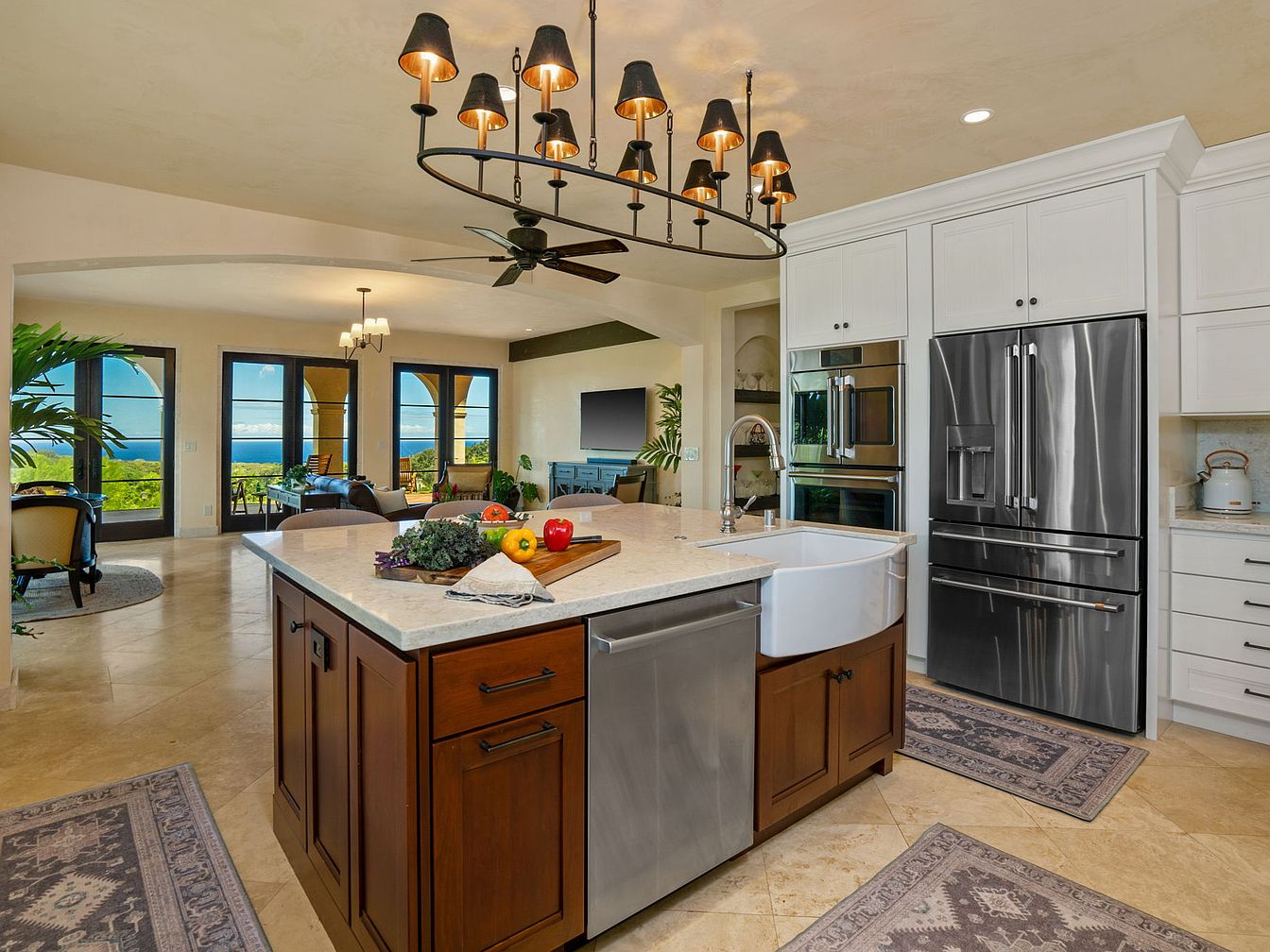 An open-concept kitchen and living area blends comfort and elegance with a warm, inviting tone. The kitchen features a spacious island with a farmhouse sink, granite countertops, and rich wooden cabinetry, complemented by modern stainless steel appliances and crisp white upper cabinets. A stylish chandelier and ceiling fan create cohesion and comfort. The family-friendly design includes ample counter space for meal prep, large walkways, and easy access to the adjoining living room and patio. Natural light floods through expansive glass doors, opening to breathtaking views, while soft, earthy floor tiles and area rugs anchor the space in a timeless, welcoming aesthetic.