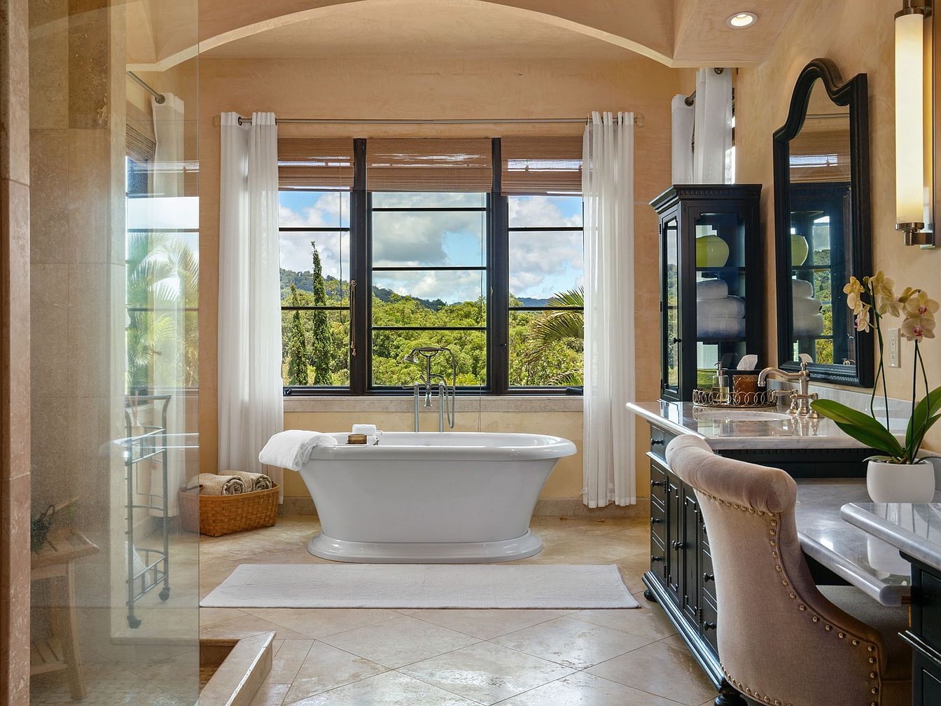 A luxurious master bathroom filled with natural light offers inspiring views of the outdoors through expansive windows framed with sheer white curtains. The centerpiece, a classic freestanding tub, sits atop neutral stone flooring, promising relaxation and serenity. Elegant black cabinetry contrasts beautifully with the warm beige walls, providing ample storage for towels and essentials. A comfortable, tufted chair at the vanity invites a peaceful morning routine, while fresh flowers and soft lighting add a touch of sophistication. Family-friendly details like a spacious countertop, easily accessible bath, and cozy towel basket make this space both opulent and welcoming for all ages.