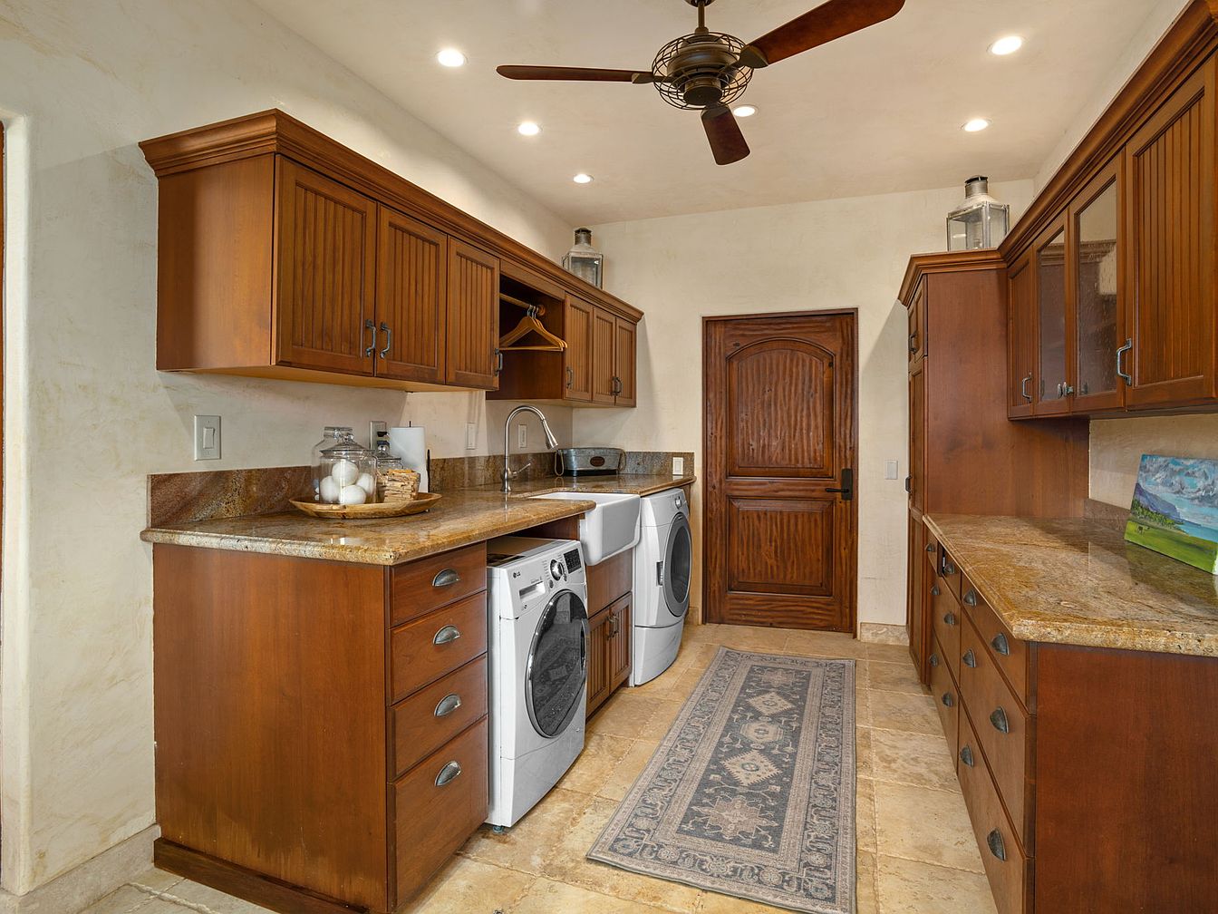 A spacious laundry room featuring warm wooden cabinetry, plenty of upper and lower storage, and ample granite countertops for folding and organization. Modern front-loading washer and dryer units sit conveniently beneath the counter, with a deep sink and hanging space above for easy garment care. Recessed lighting and a ceiling fan create a bright, welcoming environment. Neutral travertine floor tiles add durability and elegance, complemented by a beautiful patterned rug that softens the space. Family-friendly and functional, this area effortlessly handles the demands of busy households, providing both practicality and comfort in its well-organized layout.
