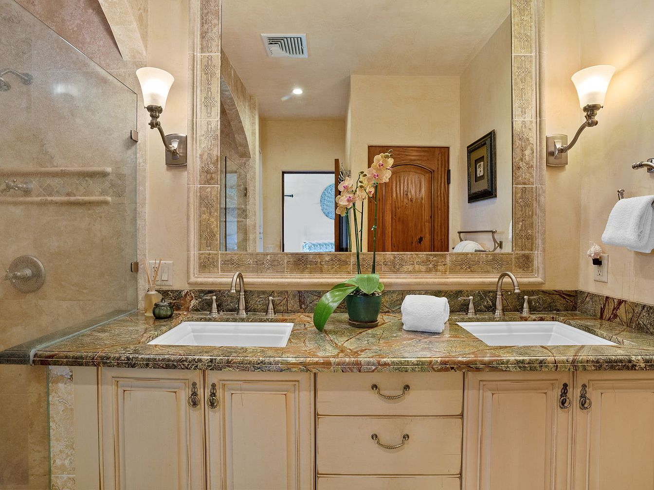 A luxurious double vanity bathroom features a spacious layout with elegant granite countertops and dual sinks, perfect for accommodating family routines. The large, ornately framed mirror enhances the sense of space and reflects natural light, creating a bright, inviting atmosphere. Warm cream and beige tones dominate the color palette, complemented by soft, underlit sconces that provide a relaxing ambiance. Classic cabinetry offers generous storage, while a glass-enclosed shower boasts refined tile work and built-in shelving, adding both style and practicality. A potted orchid and neatly rolled towels bring a touch of freshness, making this space both comfortable and family-friendly.