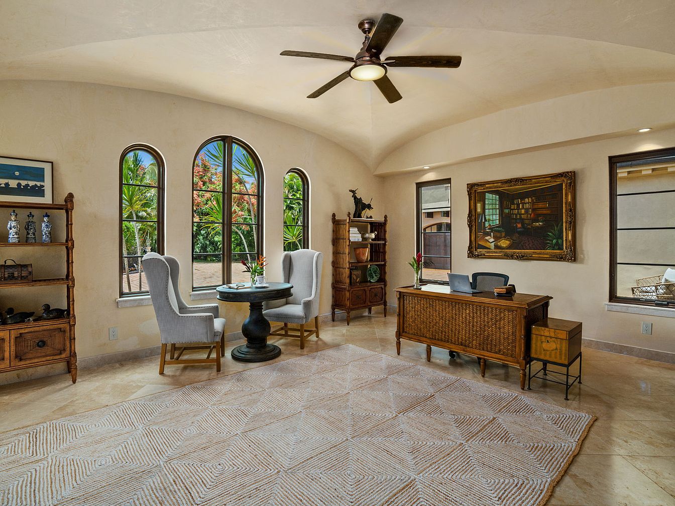 Sunlight streams through arched windows, illuminating a spacious home office that blends sophistication with comfort. Creamy walls, neutral tile flooring, and a soft patterned rug establish a calm, airy atmosphere. The wooden desk provides a practical workspace while elegant shelving adds both storage and decorative appeal, perfect for family needs. Two plush wingback chairs flank a round table, ideal for casual meetings or collaborative projects. Warm wood tones and curated art pieces enhance the inviting, personalized vibe. Ample space allows children or guests to join comfortably, making this office as functional as it is stylish. Rounded ceiling and ceiling fan add a touch of architectural interest.