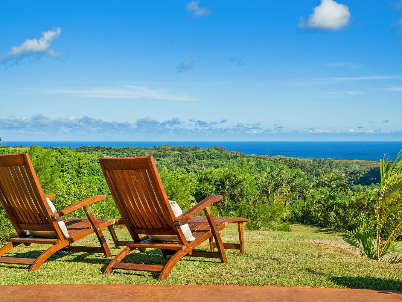A serene backyard retreat features two comfortable wooden lounge chairs positioned to maximize stunning panoramic views of lush greenery and the brilliant blue ocean beyond. The open lawn provides ample space for children to play safely, while adults can relax and enjoy nature’s beauty. The space is family-friendly, inviting, and ideal for conversations or quiet moments under the sun. Earthy wood tones of the furniture harmonize perfectly with the vibrant green landscape, creating a relaxing, resort-style atmosphere. Thoughtful landscaping with tropical plants enhances the tranquil vibes, making this backyard an ideal place for both relaxation and family gatherings.