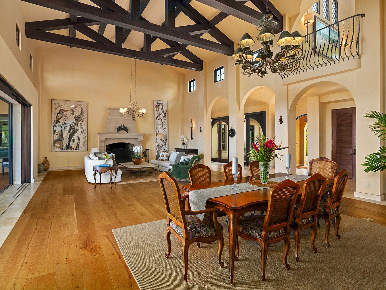 This open-concept dining and living space features a striking blend of elegance and warmth, ideal for hosting family gatherings and casual evenings alike. The dining area is defined by a polished wood table and classic upholstered chairs, bathed in natural light from large windows and illuminated by a dramatic chandelier overhead. The adjacent living area invites relaxation with stylish sofas, a grand fireplace, and modern artwork. Warm, neutral-toned walls, exposed wooden beams, and arched doorways add architectural interest, while wide plank hardwood floors offer durability for family life. Accents of fresh greenery and vibrant flowers complete the inviting ambiance.