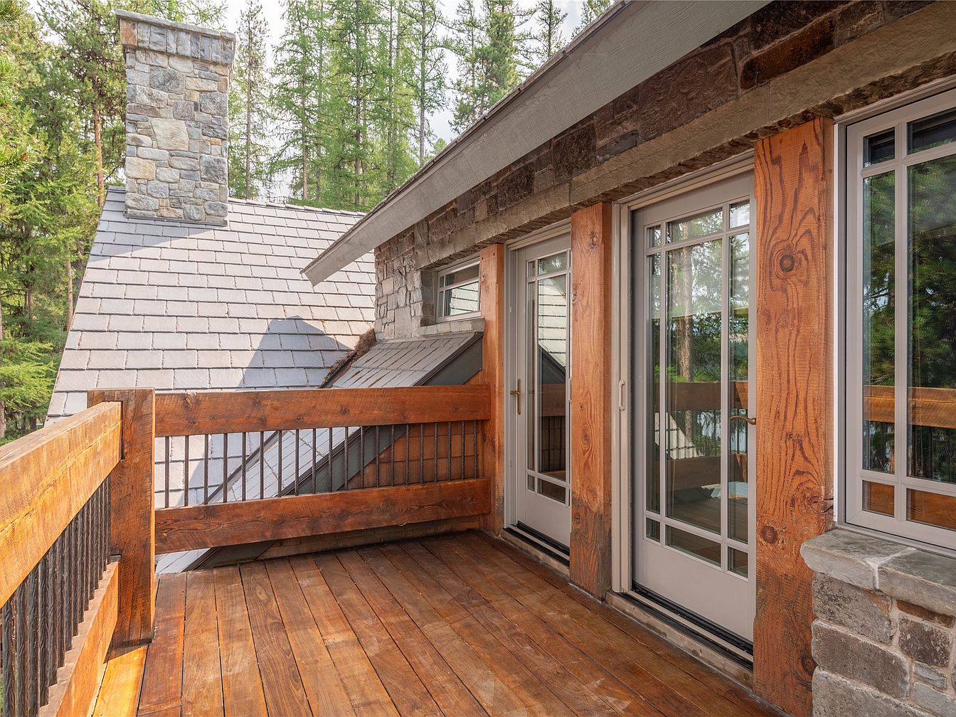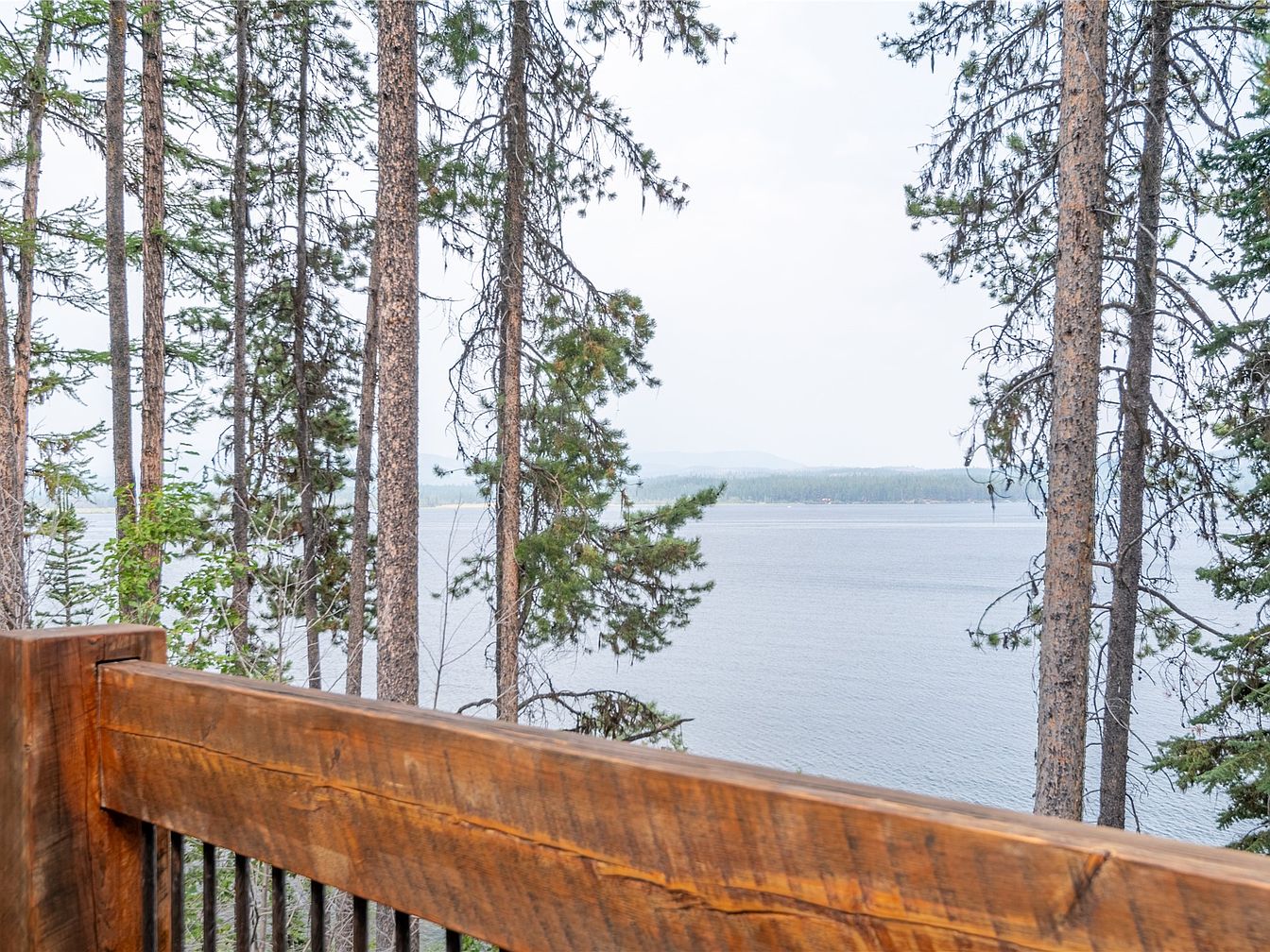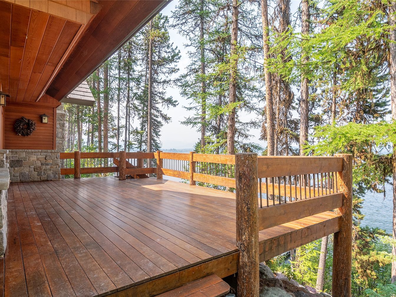 Showcasing a tranquil deck space with a sturdy wooden railing overlooking a scenic lakeside, this area offers an inviting and peaceful retreat perfect for families who love the outdoors. The natural wood finish of the railing seamlessly blends with the towering pines, creating a harmonious connection between the home and its scenic environment. The view opens up to a serene water expanse, providing ample opportunity for relaxation, outdoor gatherings, or children’s play in a safe enclosed area. The neutral, earthy tones throughout cultivate a welcoming atmosphere that highlights nature as the ultimate design element of this home.