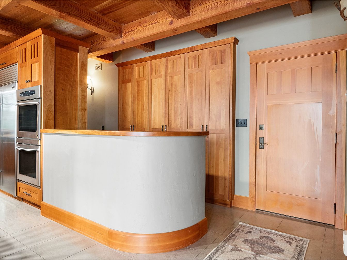 Warm wood tones create a welcoming atmosphere in this kitchen entryway, featuring custom cabinetry and trim that blend seamlessly with an exposed beamed ceiling. The thoughtful layout maximizes storage with tall cabinets and built-in stainless steel appliances, emphasizing functionality for a busy family. Neutral wall colors soften the look, and a curved peninsula subtly defines the kitchen area while providing additional workspace or seating. Ceramic tile flooring ensures durability and easy cleanup, perfect for family use. Subtle lighting and a soft area rug at the entrance add to the cozy charm, making this space practical yet inviting for everyday living.