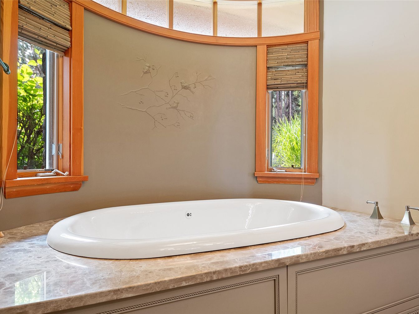 This tranquil bathtub nook features a luxurious oval soaking tub set into a marble-topped alcove, providing a spa-like retreat for relaxation. The space is framed by warm wooden window trims and soft beige walls, enhanced by a delicate embossed branch and bird motif that adds an elegant, nature-inspired touch. Multiple windows allow natural light to flow in, brightening the neutral tones and connecting the space to the lush outdoors. The earthy color palette and natural materials create a cozy, inviting atmosphere perfect for family downtime, with durable surfaces and simple lines that ensure both beauty and practicality.
