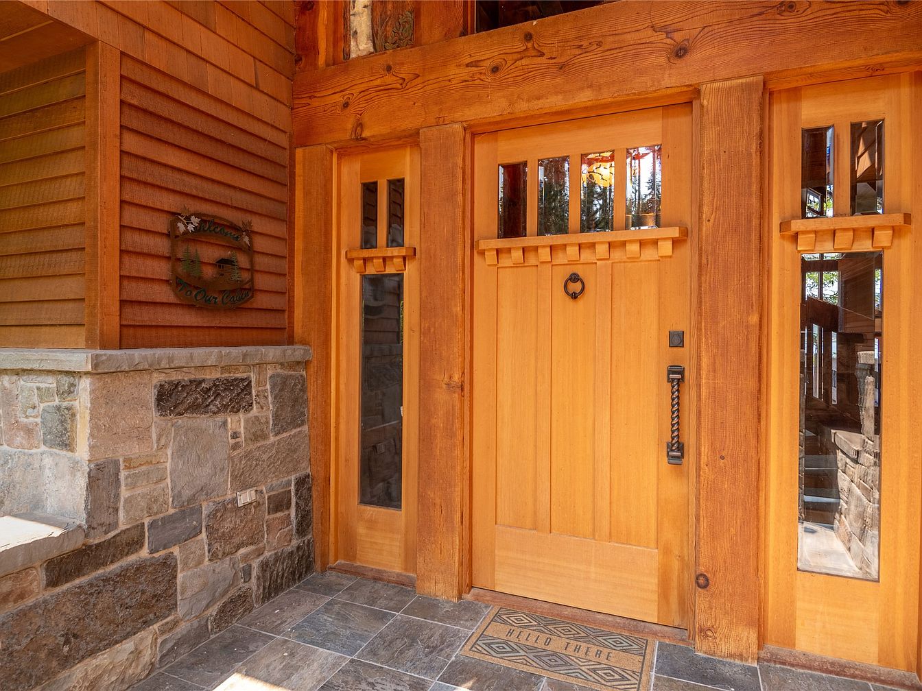 A warm, welcoming entryway features a solid wood front door flanked by tall, narrow windows that invite natural light indoors while preserving privacy. The hand-forged metal handle and knocker lend a rustic, craftsman touch. Richly textured, earth-toned stonework along the lower walls is both attractive and durable, with horizontal wood siding above creating a harmonious blend of natural materials. Neutral slate tile flooring at the threshold ensures easy maintenance for family life. Friendly accents, including a “Welcome” sign and a patterned doormat, make this space inviting for guests and practical for everyday living, embodying both charm and functionality.