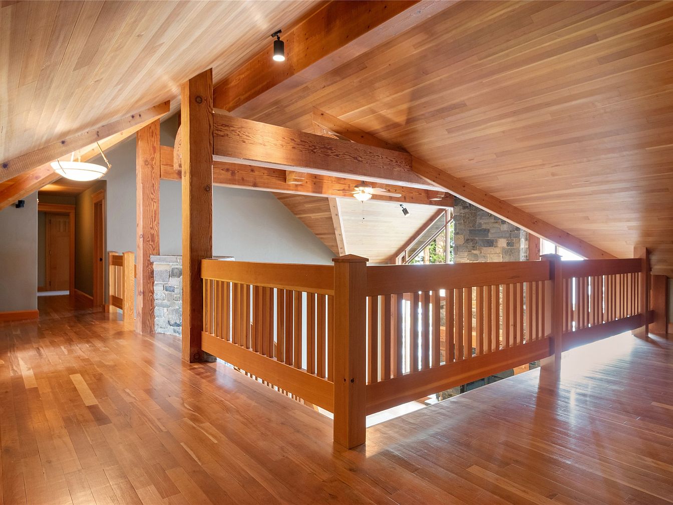 A spacious upstairs hallway features warm, honey-toned wooden floors and ceiling, highlighted by exposed beams for a classic rustic appeal. The open-sided railing overlooks the main living area below, providing a sense of connection and ample natural light. Stone accent walls add texture and a touch of mountain lodge charm. The wide passageway and clear, child-friendly railings make this an ideal spot for families, ensuring safety and visibility throughout the upstairs area. Recessed and pendant lighting offer soft illumination, creating a welcoming and comfortable walkway that seamlessly blends architectural interest with practical living.