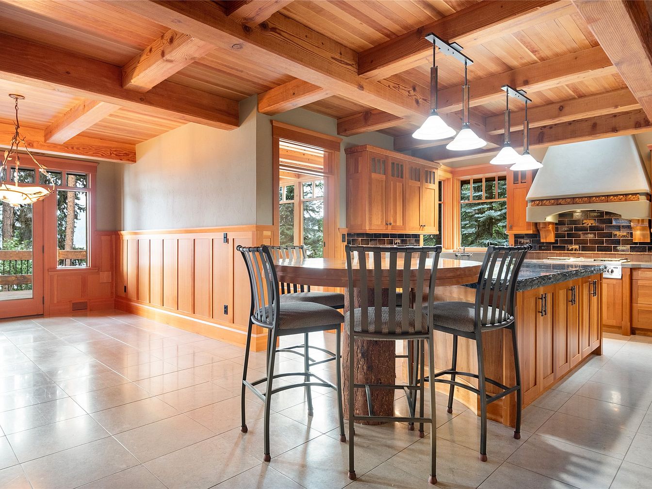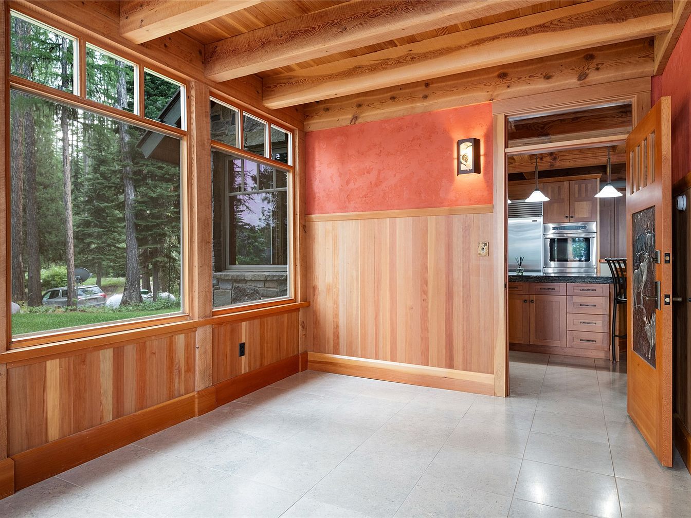 Warm wood paneling and exposed ceiling beams define this inviting dining nook, offering a cozy yet bright transition between kitchen and living spaces. Expansive windows flood the area with natural light while framing serene forest views, perfect for family gatherings or enjoying quiet meals. Subtle earth-toned tiles add sophistication to the floor, complementing the rich grain patterns of the walls and ceiling. The smooth blend of natural wood and soft terracotta accents creates a cabin-inspired atmosphere, while the open layout into the kitchen makes supervising children and entertaining guests easy and comfortable for any family.