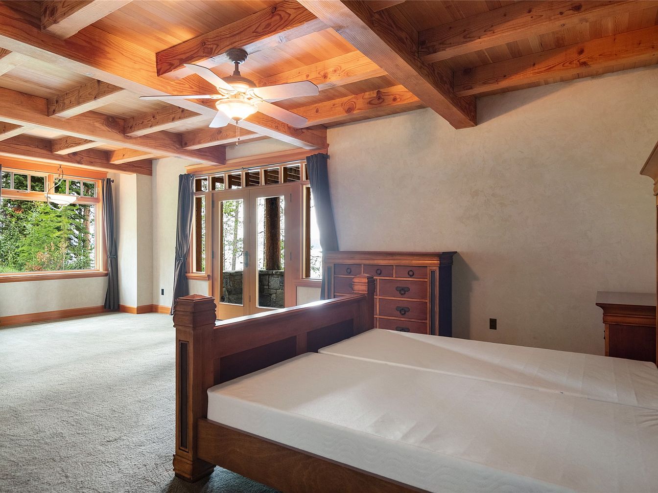 Warm wood tones from the exposed beam ceiling and furniture give this master bedroom a welcoming, rustic ambiance perfect for families. Expansive windows and French doors let in abundant natural light and offer a scenic view of lush greenery outside, creating an airy and tranquil space. The neutral-toned carpet softens the room, making it safe and comfortable for children to play. Classic wood dressers and a solid bed frame provide ample storage and durability. Subtle wall textures and dark curtains complement the natural woodwork, while a softly glowing ceiling fan light enhances the cozy yet elegant atmosphere.