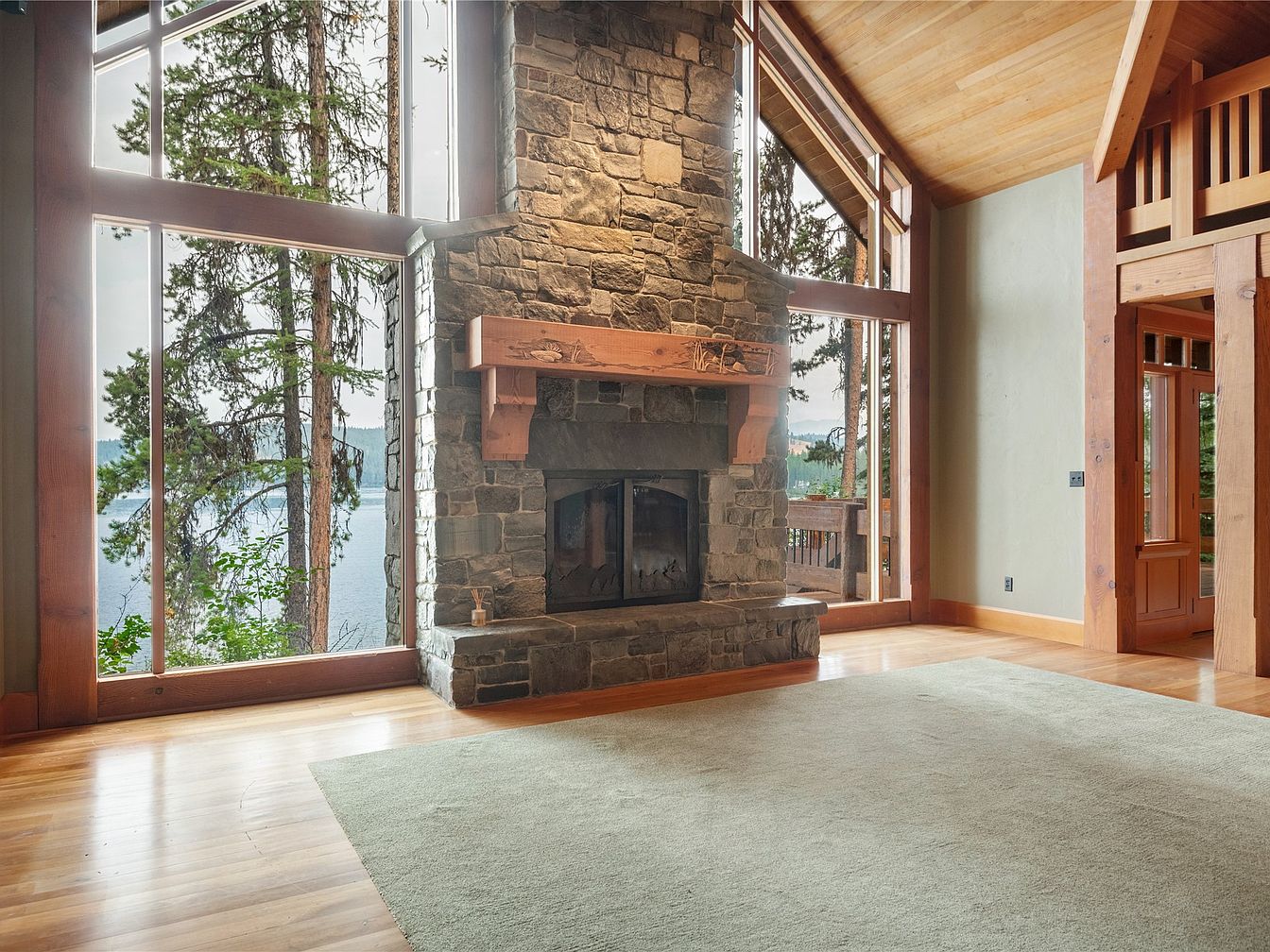 A spacious living room features a stunning floor-to-ceiling stone fireplace as its focal point, framed by expansive windows that bathe the space in natural light and offer serene views of the surrounding forest and water. The vaulted wooden ceilings and exposed beams add a rustic, cabin-like charm, while the soft neutral wall colors create a warm, inviting atmosphere. The hardwood floors and large area rug provide a safe play space for children and allow for flexible furniture arrangement. The open layout enhances family gatherings, blending cozy comfort with an appreciation for the outdoors through uninterrupted sight lines.