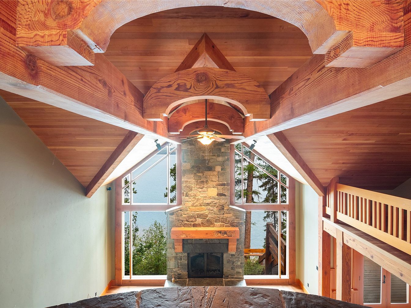 A striking loft living area showcases soaring vaulted ceilings adorned with exposed wooden beams, creating a warm and rustic ambiance ideal for family gatherings and relaxation. The open-plan layout allows natural light to stream in through floor-to-ceiling windows that frame a spectacular view of the lake and surrounding trees. A stone fireplace forms a cozy centerpiece, while the wooden railing along the upper level adds both safety and a charming cabin-like feel. The color palette harmonizes natural wood tones with soft, neutral walls, providing a comforting, welcoming environment perfect for children and adults alike.