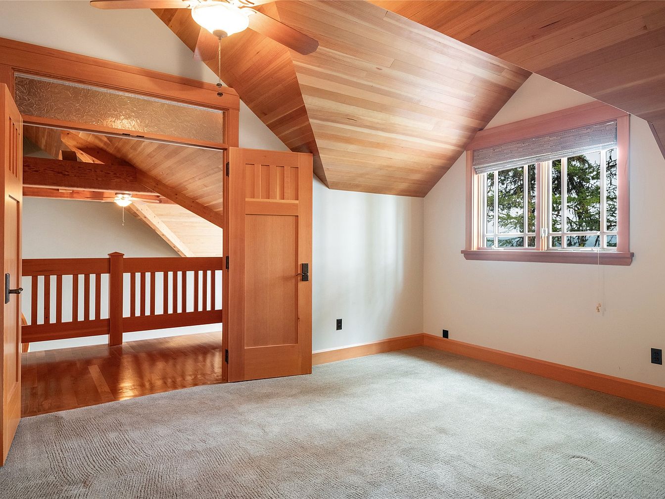Warm wood accents and a vaulted ceiling create a cozy, inviting atmosphere in this loft bedroom space. Ample natural light streams in through a wide window, offering lovely views of the surrounding greenery. The soft, neutral-toned carpet adds comfort and makes the room ideal for a family environment, perfect for play or relaxation. Double doors open out to a landing with matching wood rails, seamlessly connecting the bedroom to the rest of the home. The ceiling fan above provides both style and practicality, ensuring the room remains comfortable year-round in this beautifully detailed, family-friendly retreat.