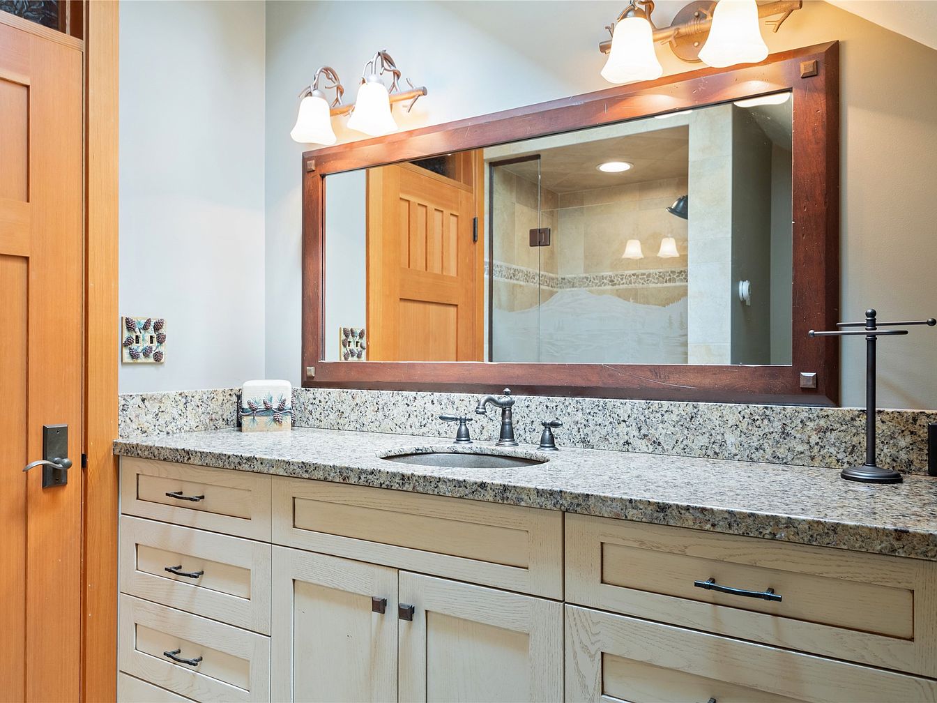 A spacious bathroom vanity sets a warm and inviting tone with its granite countertop and creamy shaker cabinetry, offering ample storage for family essentials. The large wooden-framed mirror reflects light from dual sconce fixtures, enhancing the bright, open feel of the room. Neutral wall colors provide a soothing backdrop, while the robust hardware and natural wood door complement the overall craftsman-inspired aesthetic. Practical touches, such as the tissue box and accessory stand, make this space easy for families to keep organized. The visible glass shower enclosure hints at a well-designed, functional layout beyond the vanity.