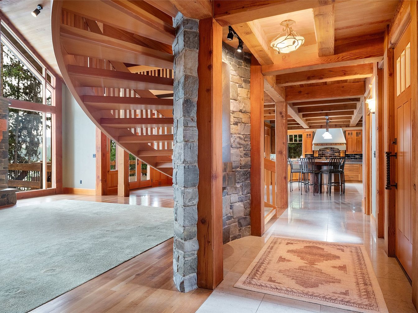 A beautifully warm entryway seamlessly transitions into the heart of the home, blending exposed timber beams and stacked stone columns for a rustic yet inviting ambiance. The dramatic curved wooden staircase acts as a sculptural centerpiece, connecting the open-plan foyer with the sunlit living area and kitchen. Natural light pours in through floor-to-ceiling windows, bouncing off hardwood floors and soft area rugs that create an inviting space for family gatherings. The kitchen is visible in the background, featuring custom wood cabinetry and a communal dining table, making it perfect for both everyday living and entertaining. Neutral tones throughout suggest timeless comfort and elegance.