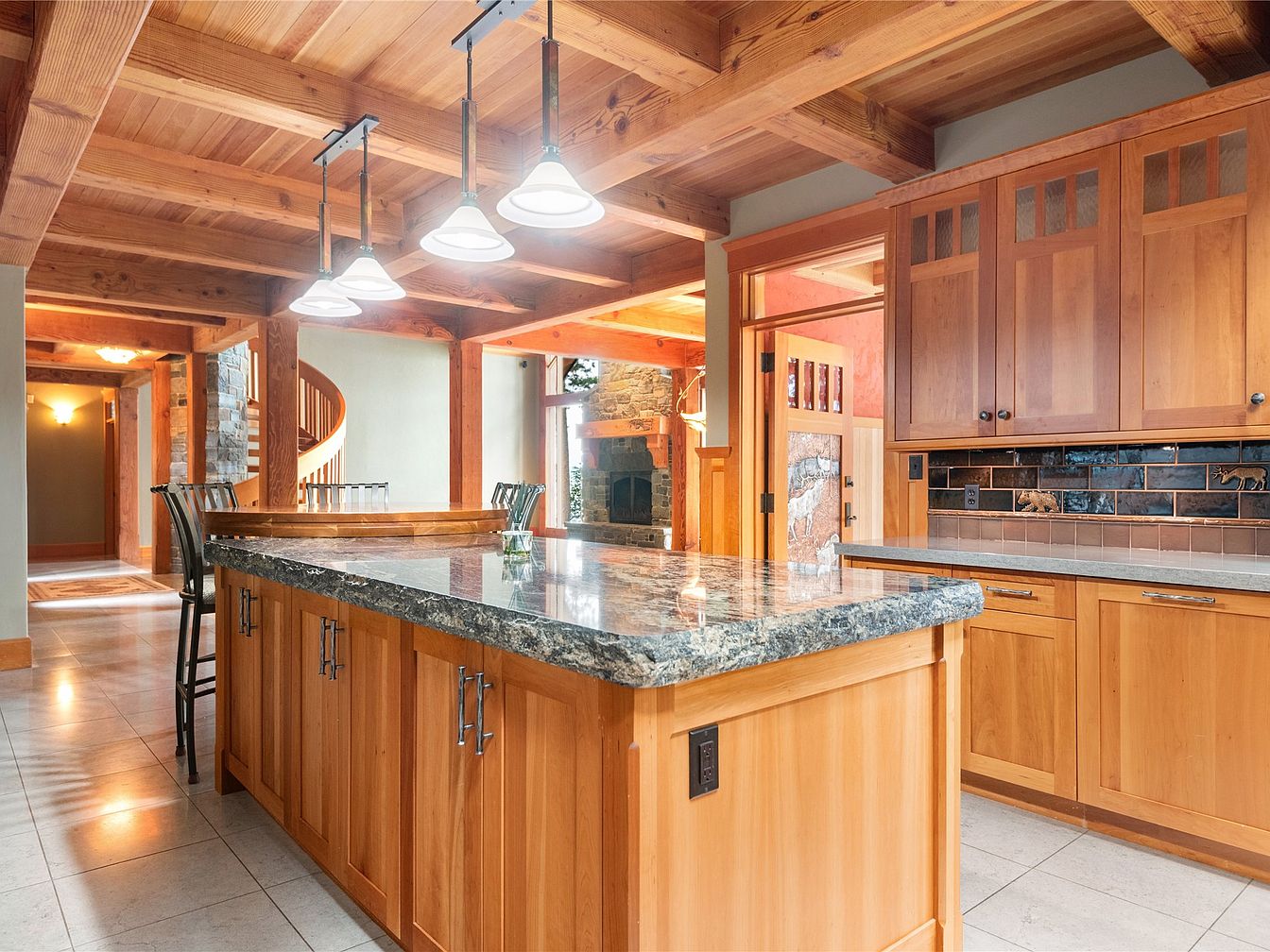 Warm wood tones and natural textures create an inviting, family-friendly kitchen space. The large central island, topped with a polished granite countertop, doubles as a workspace and breakfast bar, making it perfect for casual gatherings. Understated Shaker-style cabinetry offers ample storage, complemented by rustic backsplash tiles featuring wildlife motifs for subtle character. Stainless steel hardware and pendant lighting add modern touches, while exposed beams overhead enhance the cozy, craftsman-inspired aesthetic. The open-plan layout flows seamlessly to adjacent living spaces and a curved staircase, encouraging interaction and movement, making this kitchen the heart of the home.