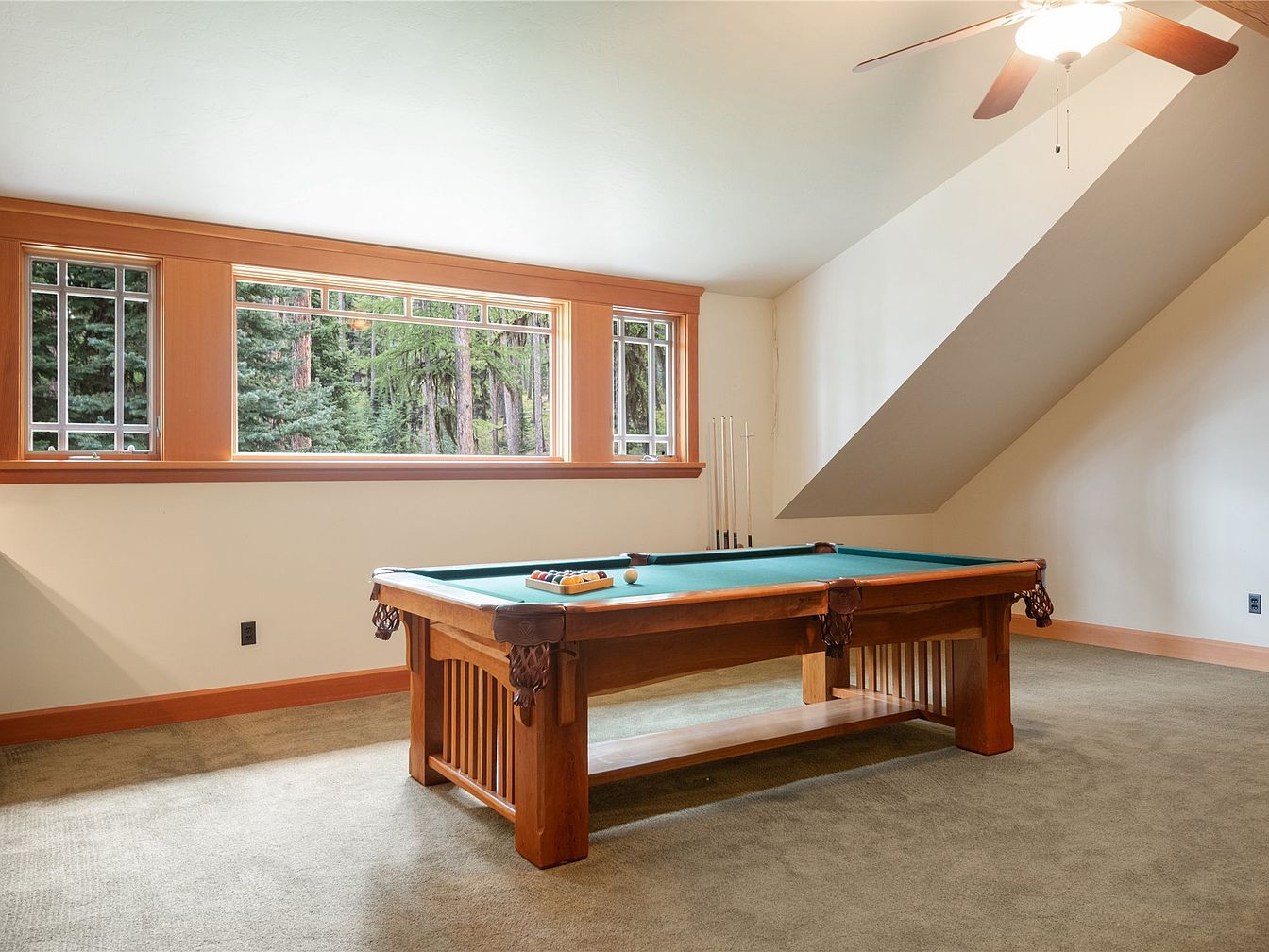 A spacious game room featuring a beautifully crafted wooden pool table as the centerpiece, perfect for family fun and friendly gatherings. Large windows framed with warm natural wood bathe the room in sunlight and offer peaceful views of the surrounding forest, creating a cozy connection with nature. Soft neutral carpeting covers the floor, providing comfort for both adults and children. The sloped ceiling adds architectural interest and gives the space a unique, inviting character. A ceiling fan helps keep the room airy, while cue racks and tidy accents ensure a welcoming and organized environment for players of all ages.