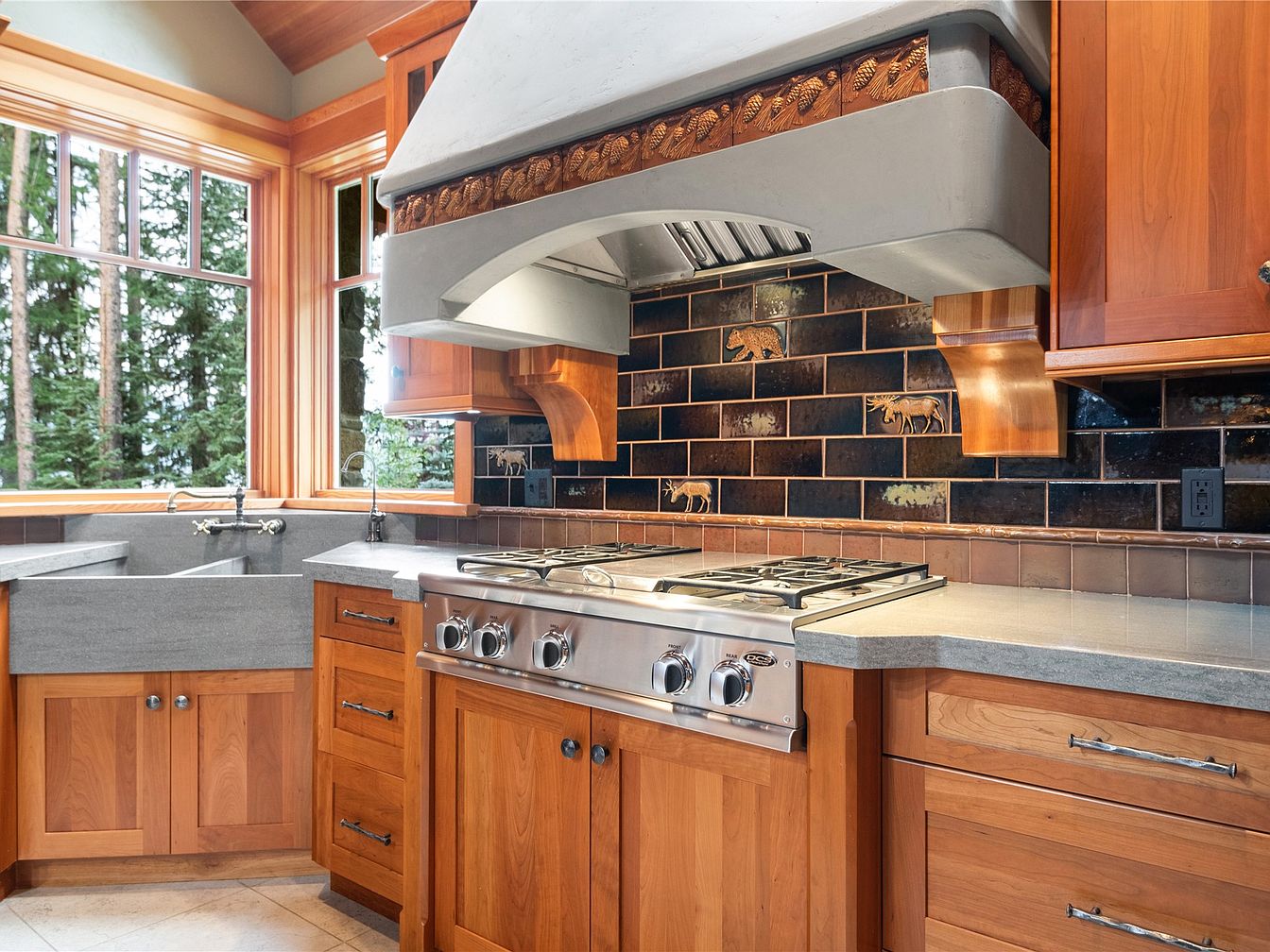 A warm, inviting kitchen featuring natural wood cabinetry and a sturdy stone countertop creates the perfect family-friendly atmosphere. The layout offers ample workspace, spacious drawers, and easy access to the stove, making it ideal for home-cooked meals with loved ones. A double farmhouse sink overlooks scenic outdoor views through large, wood-framed windows, filling the space with light. Distinctive black, brown, and tan tiles adorn the backsplash, with charming wildlife motifs that evoke a rustic, cozy ambiance. The custom range hood features pinecone detailing and reinforces the handcrafted, lodge-inspired aesthetic, blending function and artistry harmoniously.