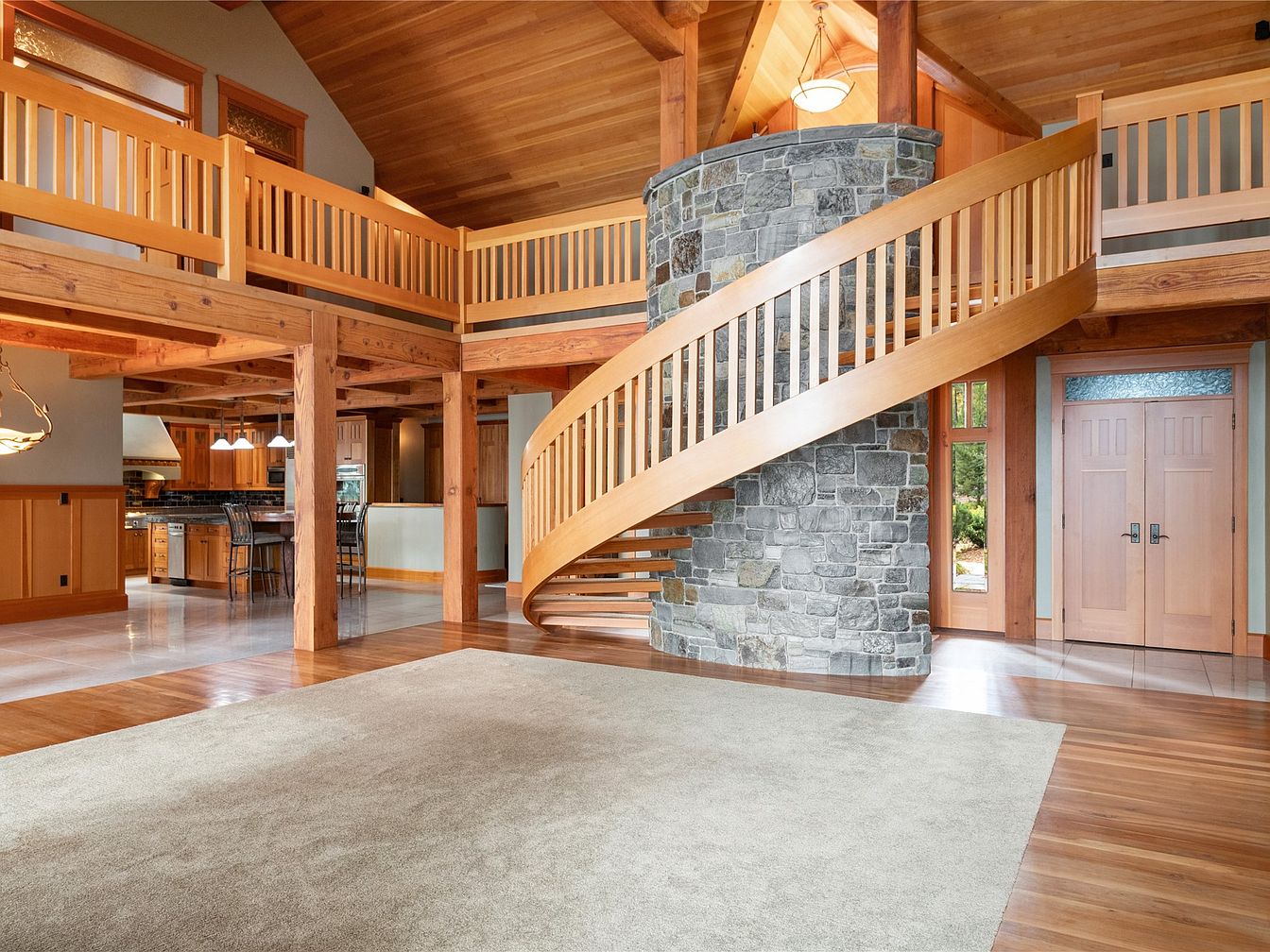 A stunning open-concept entryway welcomes guests with soaring wood-paneled ceilings and abundant natural light. A dramatic curved staircase with warm wooden rails encircles an impressive stone column, creating a central visual anchor. The layout seamlessly flows into a spacious kitchen, visible from the foyer, making it ideal for gathering and entertaining. The upper loft with wooden railings overlooks the main level, offering family-friendly sightlines and connectivity. Neutral-toned flooring pairs beautifully with the light wood finishes, while double doors and oversized windows enhance the airy, inviting atmosphere. Perfect for families, this space feels both expansive and cozy.