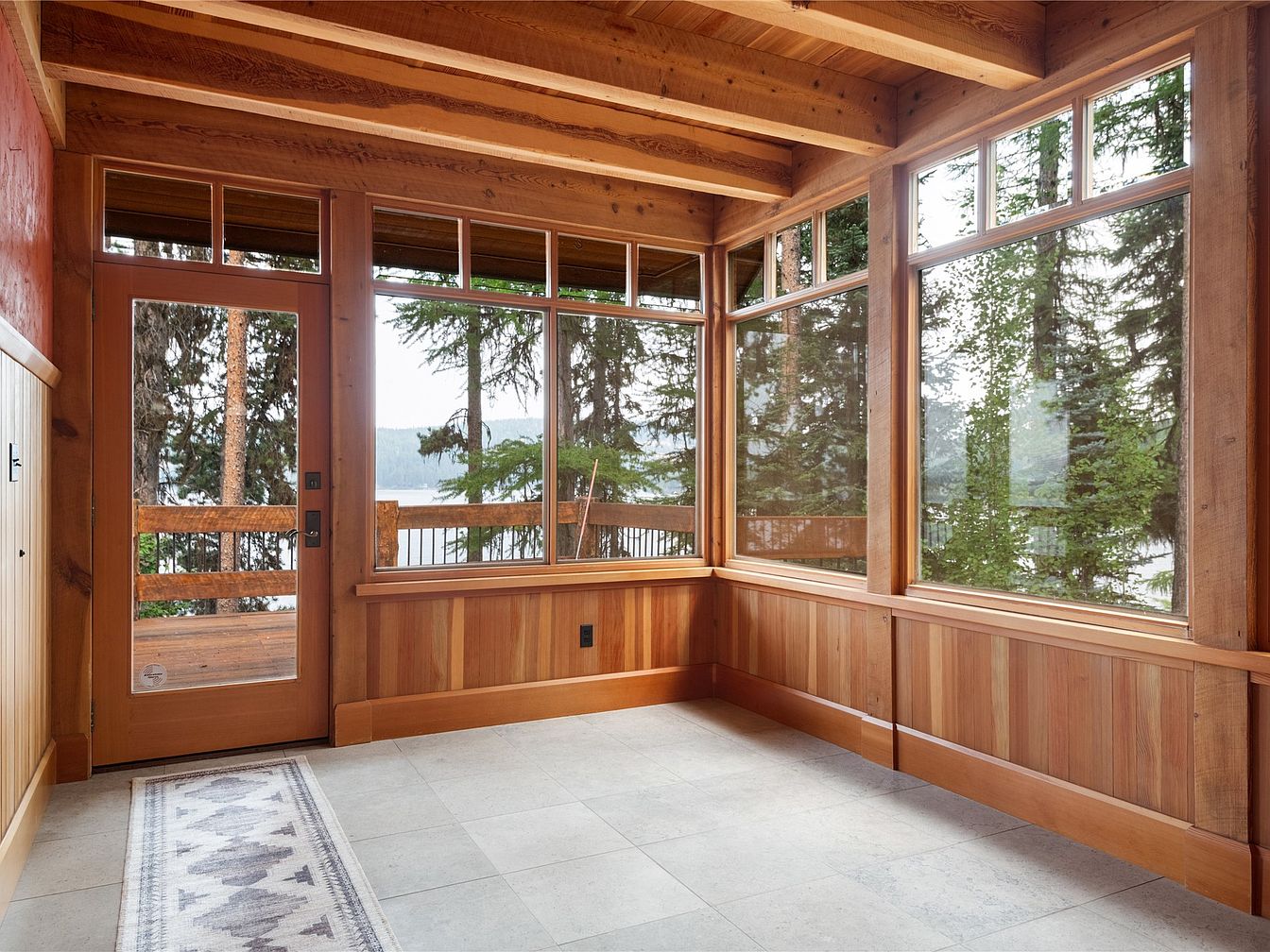 This sunroom welcomes an abundance of natural light through expansive windows that provide a scenic view of the surrounding forest and lake, creating a tranquil setting for relaxation or family gatherings. The warm tones of the natural wood paneling, exposed beams, and trim evoke a cozy, rustic charm, making it easy to feel connected with nature. Neutral stone tile floors add to the room’s durability and family-friendly appeal, while the minimalistic layout allows for flexible use—ideal for a play area, reading nook, or casual seating. The simple runner rug introduces a touch of pattern without overpowering the serene atmosphere.