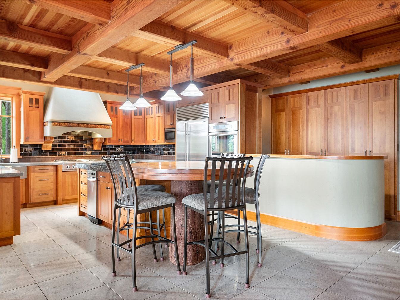 Warm natural wood cabinetry and exposed timber beams set a welcoming tone for this open kitchen, perfect for busy families and entertaining alike. The spacious central island includes a rustic wood base and is surrounded by comfortable bar stools, ideal for casual dining or helping kids with homework. Sleek stainless steel appliances provide modern convenience, while the dark tile backsplash adds contrast and depth to the room. Ample storage is built into custom cabinetry, and the gentle curve of the breakfast bar softens the space, promoting an easy flow. Neutral stone flooring keeps the area practical and easy to clean.