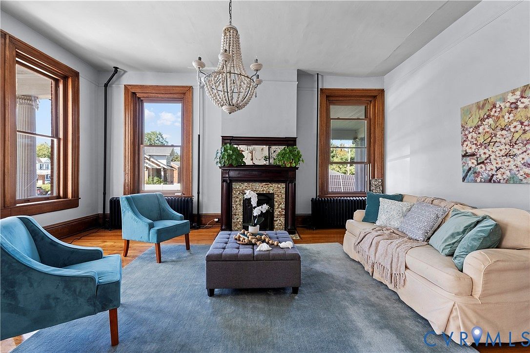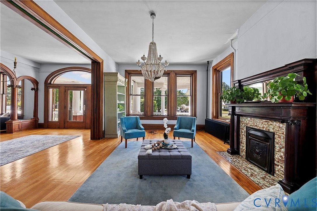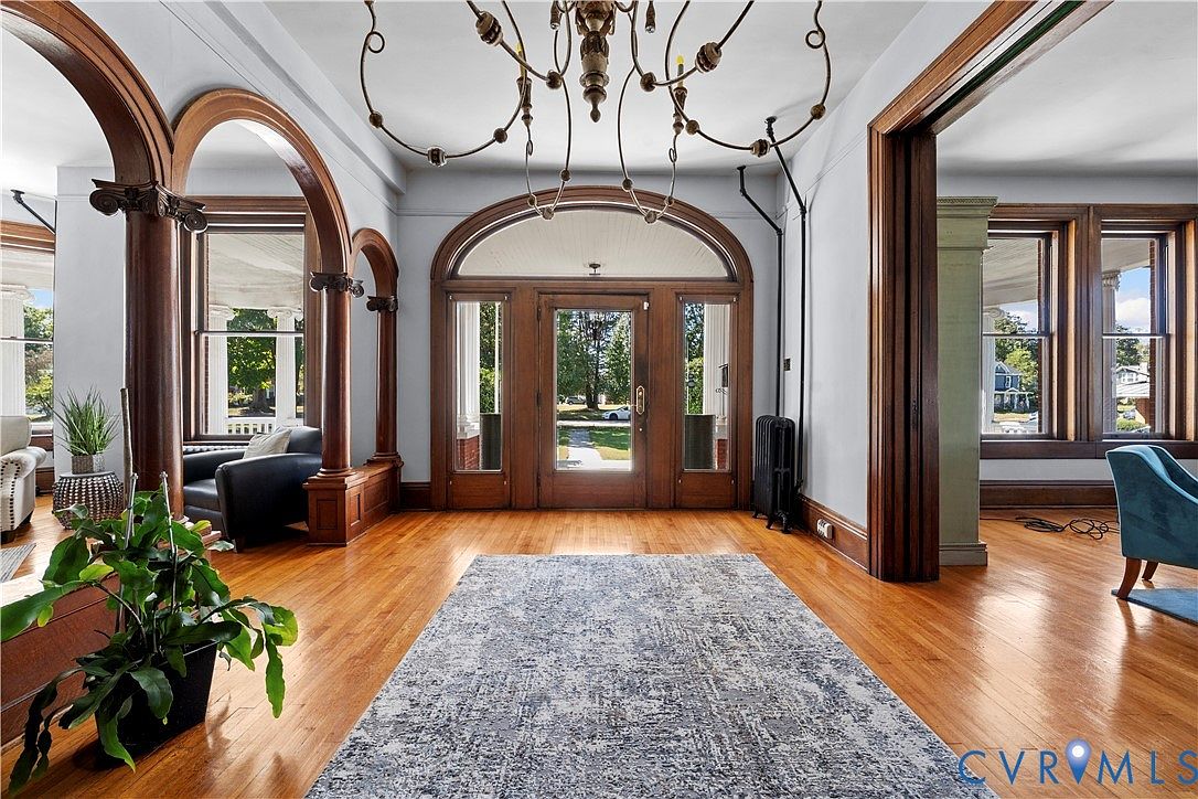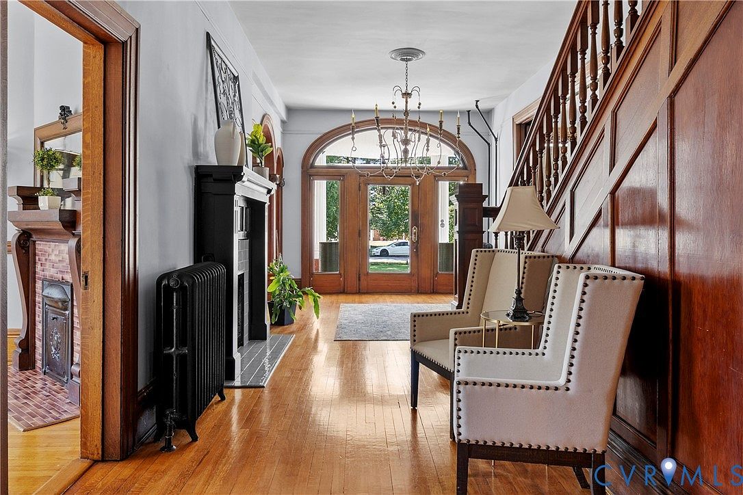 This inviting foyer combines elegance and functionality, showcasing a blend of modern and classic design elements. Rich hardwood flooring flows seamlessly, enhanced by the warm tones of the wooden staircase and paneling. A grand archway frames the entrance, allowing natural light to pour in through large windows. The space features comfortable seating with beautifully upholstered chairs accented by decorative nailhead trim, providing a cozy nook for guests. A classic radiator adds vintage charm, while a stylish chandelier overhead elevates the atmosphere. Thoughtfully placed greenery adds a touch of life, creating a welcoming environment for family and friends.
