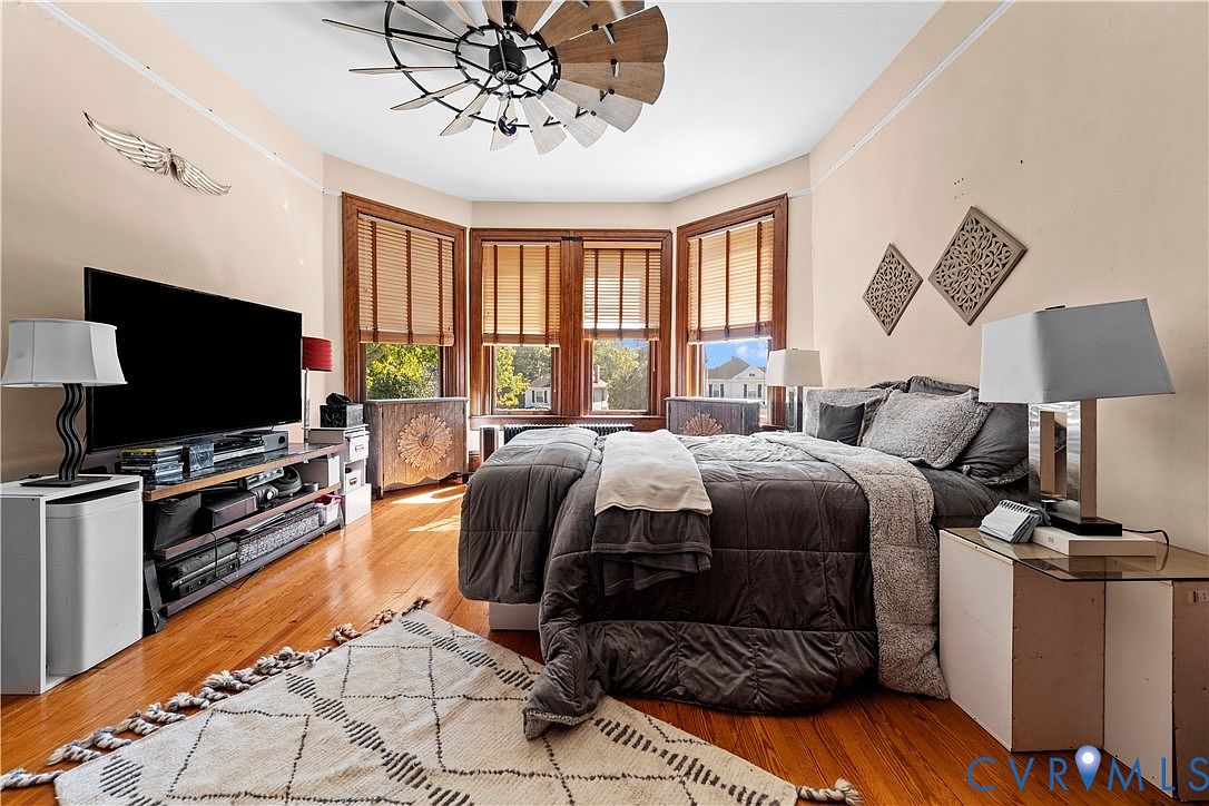 This inviting master bedroom features rich wood accents and original architectural details, with large windows allowing ample natural light. The room showcases a cozy bed adorned with plush, dark bedding, providing a restful retreat. A unique, vintage-style ceiling fan adds character, complementing the room’s tranquil vibe. The dark hardwood floor contrasts beautifully with a soft, patterned area rug, enhancing the comfort of the space. Built-in shelving and entertainment options offer functionality, while the warm color palette creates an inviting atmosphere. This room is perfect for relaxation and family gatherings, blending style with comfort.