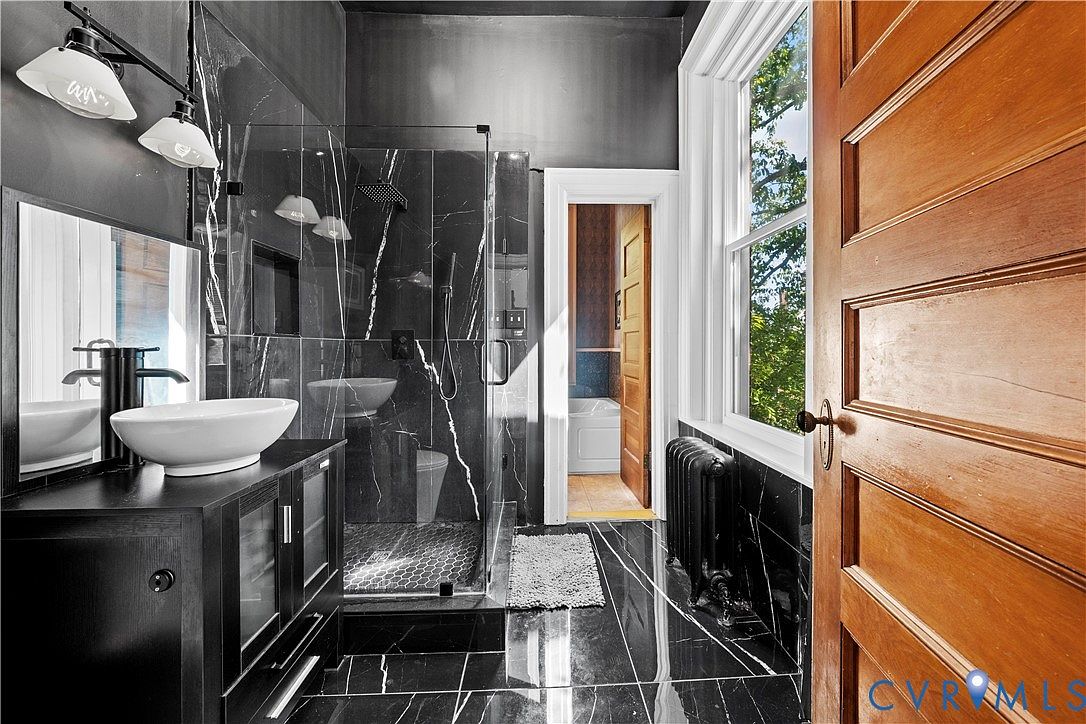 This modern bathroom showcases a striking blend of elegance and functionality. The sleek black marble walls and flooring create a sophisticated ambiance, accented by a minimalist black vanity topped with a white vessel sink. A large glass shower stall with a rainfall showerhead enhances the spa-like feel, while stylish sconces provide ample lighting. Natural light floods the space through a large window, illuminating the room and highlighting its luxurious elements. The architectural details, including the classic door and window frames, add warmth, making this bathroom not only a personal retreat but also family-friendly for everyday use.